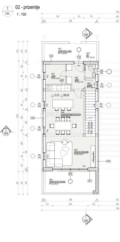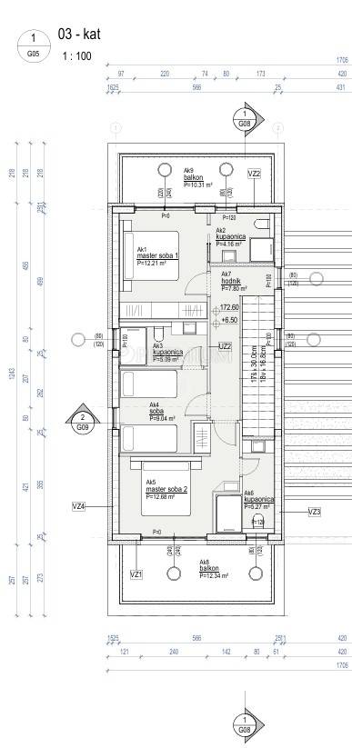 Na prvom katu smještene su tri spavaće sobe, svaka s vlastitom kupaonicom, dok dvije sobe imaju izlaz na balkon. Unutarnjim stepeništem dolazi se u prizemlje gdje se nalazi hodnik, gostinjski wc, spremište te prostrani open space dnevni boravak s kuhinjom i blagovaonom, s izlazom na natkrivenu terasu.