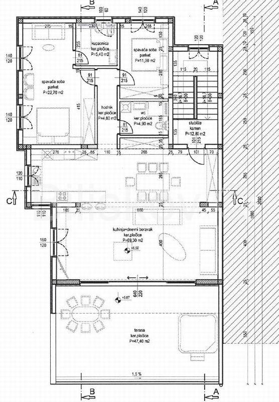 Stan se sastoji od kuhinje i dnevnog dijela (69,30 m2) na koje se nadovezuje prostrana terasa od 47,40 m2 sa prekrasnim panoramskim pogledom na more.