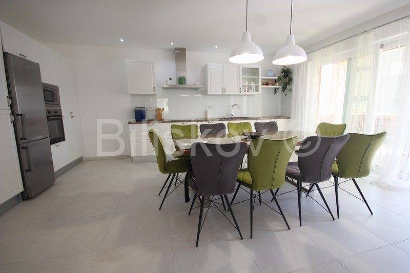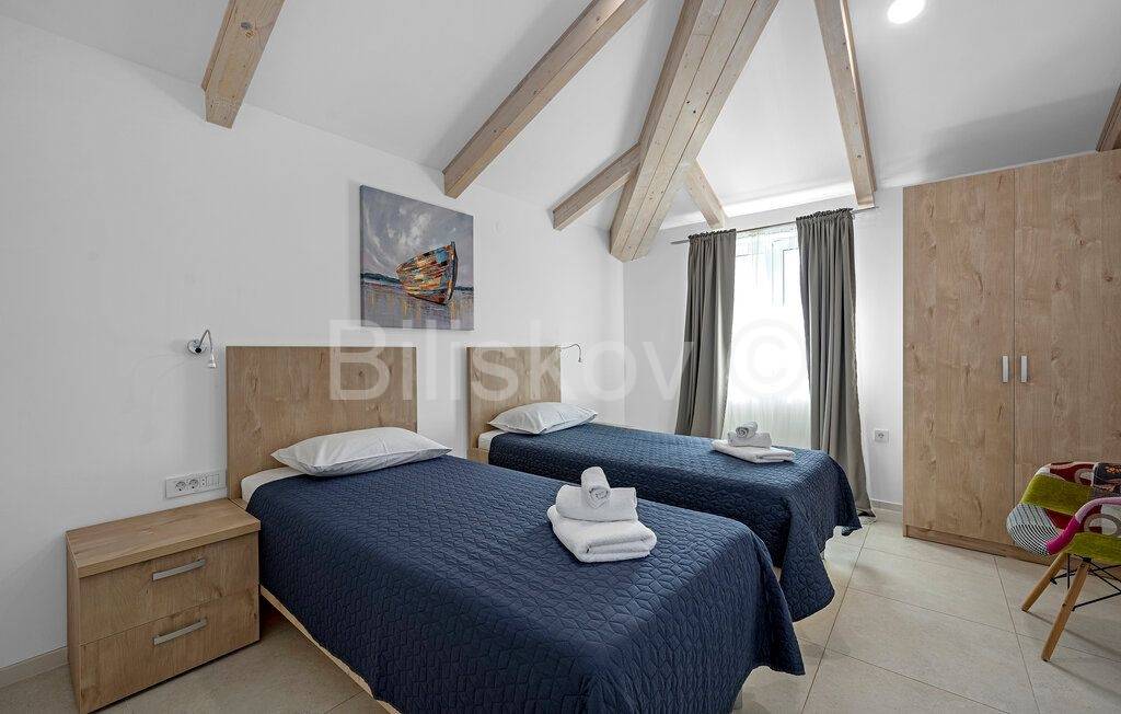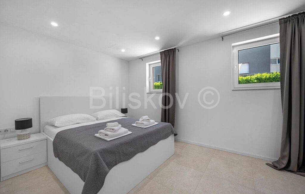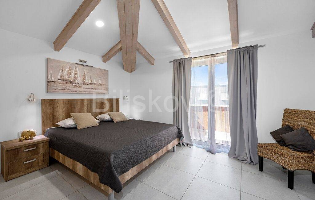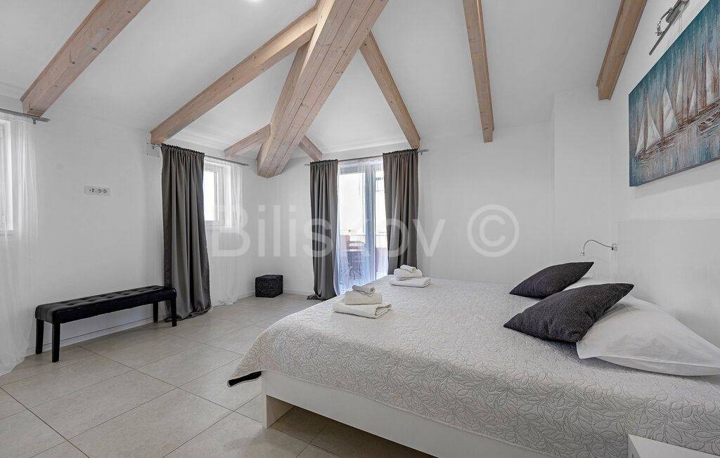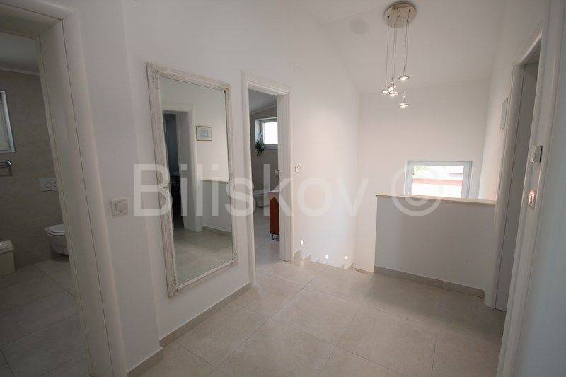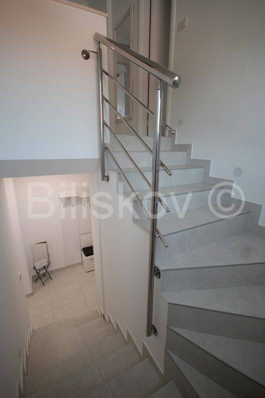 Glavni ulaz kuće nas vodi do iznimno prostranog prizemlja u kojem se nalaze dnevni boravak, moderno uređena i opremljena kuhinja s blagovaonicom (zajedno cca 55 m2) sa izlazom na terasu. Nadalje, u prizemlju se nalaze i dvije spavaće sobe, jedna s vlastitiom kupaonicom, zasebni wc, te ostava. Stepenice nas vode na gornju etažu na kojoj se nalaze tri spavaće sobe, od kojih dvije imaju izlaz na terasu, te dvije kupaonice.