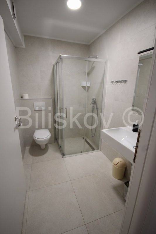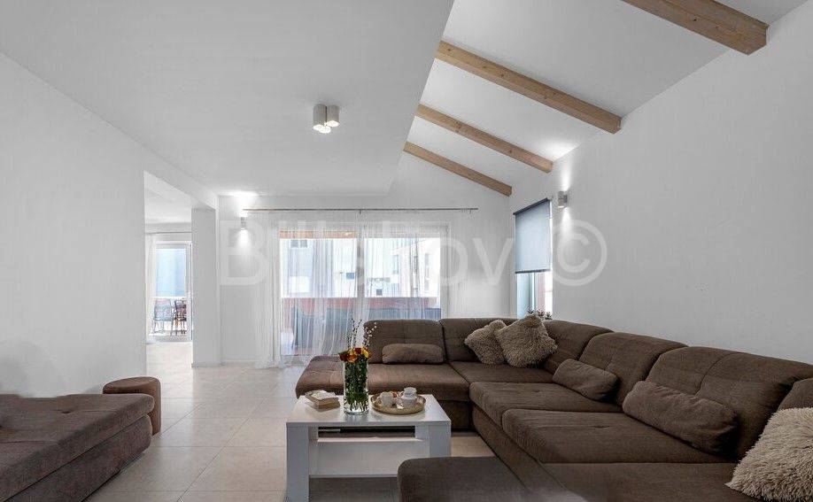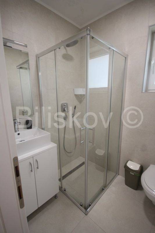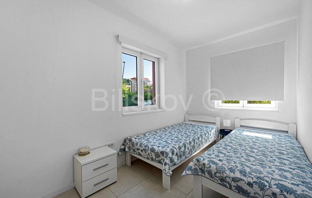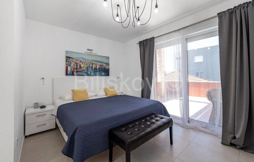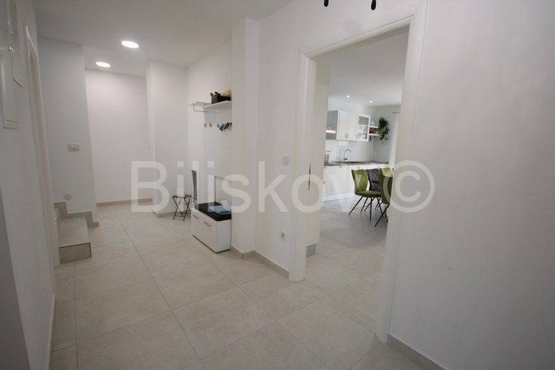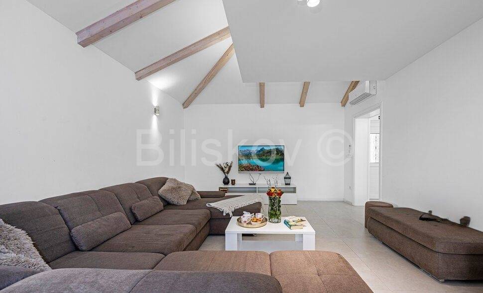 Glavni ulaz kuće nas vodi do iznimno prostranog prizemlja u kojem se nalaze dnevni boravak, moderno uređena i opremljena kuhinja s blagovaonicom (zajedno cca 55 m2) sa izlazom na terasu. Nadalje, u prizemlju se nalaze i dvije spavaće sobe, jedna s vlastitiom kupaonicom, zasebni wc, te ostava. Stepenice nas vode na gornju etažu na kojoj se nalaze tri spavaće sobe, od kojih dvije imaju izlaz na terasu, te dvije kupaonice.