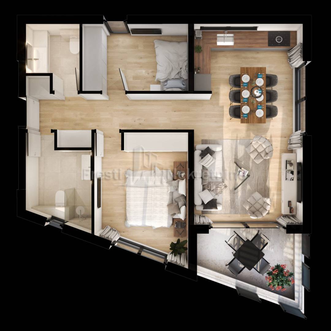 TLOCRTNI RASPORED:Hodnik – 7,95 m²Kuhinja s blagovaonicom i dnevnim boravkom – 24,58 m²Spavaća soba 1 – 12,55 m²Spavaća soba 2 – 7,99 m²Kupaonica 1 – 5,85 m²Kupaonica 2 – 3,51 m²Lođa – 5,51 m² (obračunski)