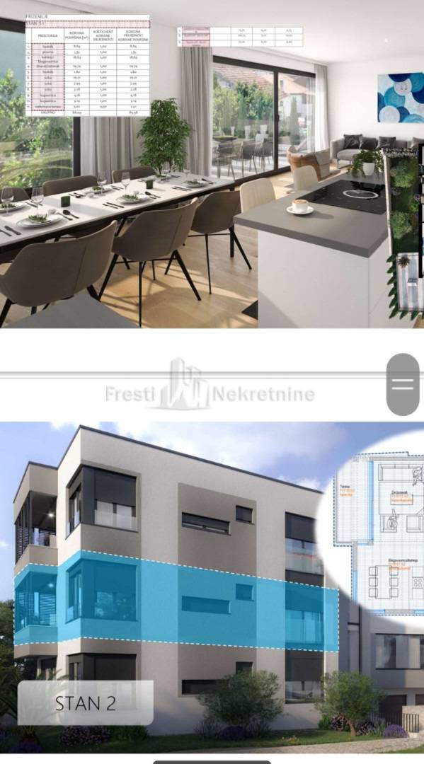 S1 (prizemlje) – 117,95 m² – 399.000 €S2 (1. kat) – 102,19 m² – 385.000 €S3 (1. kat) – 81,70 m² – 295.000 €S4 (2. kat) – 102,19 m² – 385.000 €S5 (2. kat) – 81,70 m² – 295.000 €PP1 – poslovni prostor – 78,89 m² – 320.000 €