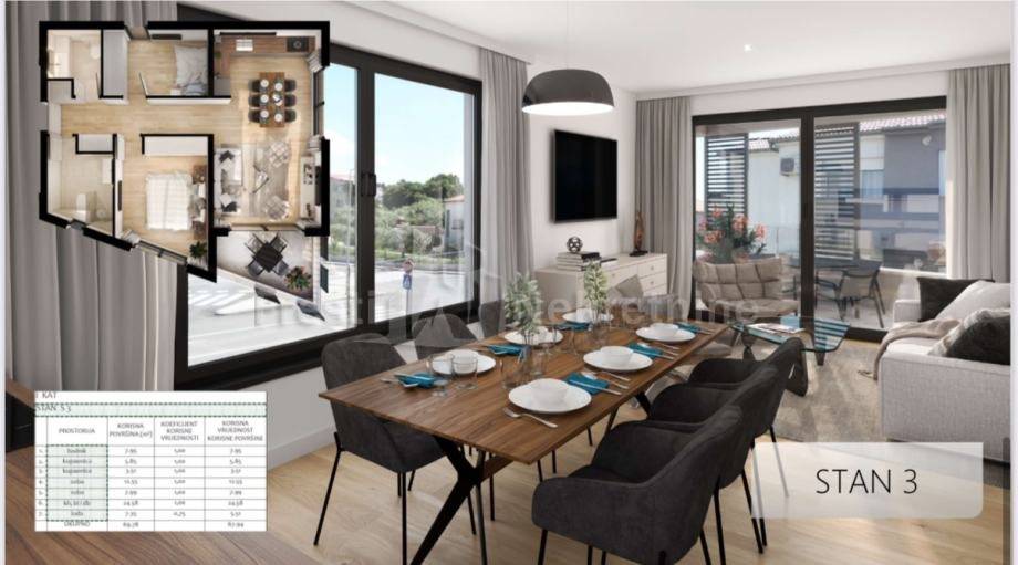 OSNOVNE INFORMACIJE O STANU S3:* Položaj: 1. kat* Broj soba: 2* Broj kupaonica: 2* Ukupna neto korisna površina stana s pripacima: 81,70 m²* Bruto površina s uključenim parkirnim mjestima: 97,28 m²* Cijena: 295.000 EUR* Parkirna mjesta: 2 u zajedničkoj garaži (27,50 m² bruto / 13,76 m² neto)