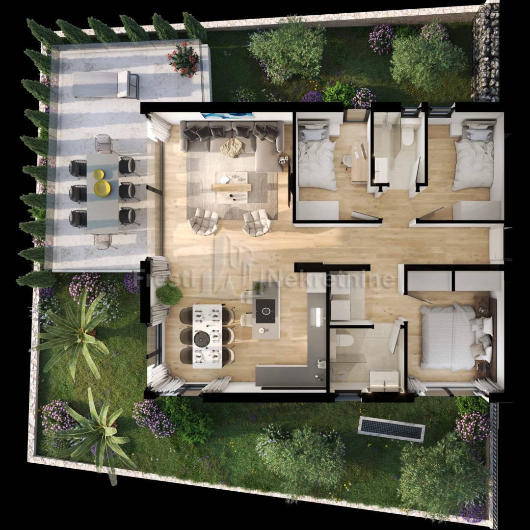 Armirano-betonsku konstrukciju i termofasadu (10 cm)ALU-PVC troslojnu stolariju s elektro-roletnama i komarnicimaMultisplit klima sustav (klima u svakoj prostoriji)Električno podno grijanje u dnevnom boravku i kupaonicamaParket i keramiku visoke kvaliteteProtuprovalna i protupožarna ulazna vrata