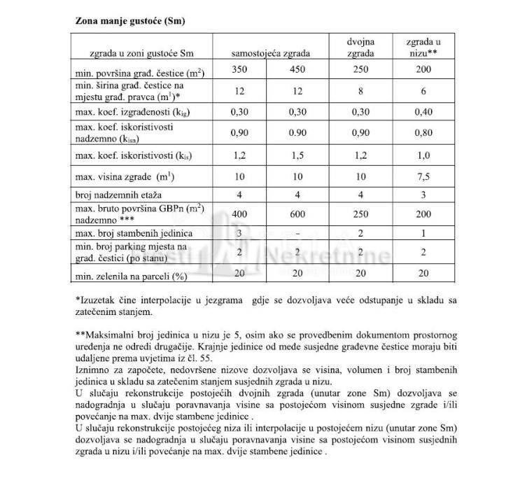 Zemljište se nalazi u zoni Sm što znači da broj stanova nije ograničen brojem, nego bruto površinom (600 m2 nadzemno) i parking mjestima (2 po stanu).Najbliže kuće se nalaze cca 150 metara od parcele.Vlasništvo uredno!