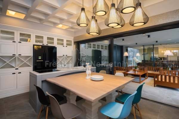 Uređeno i ograđeno dvorište upotpunjuje veliki bazen površine 48 m2 s mlaznicama za grijanje i hlađenje,okružen sunčalištem i zelenilom koje osigurava potpunu privatnost.