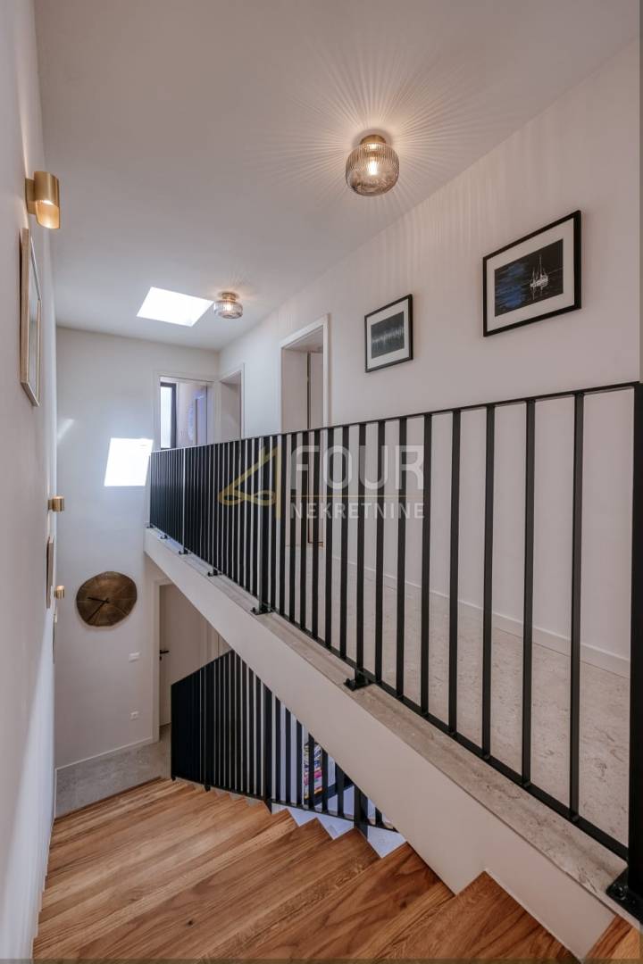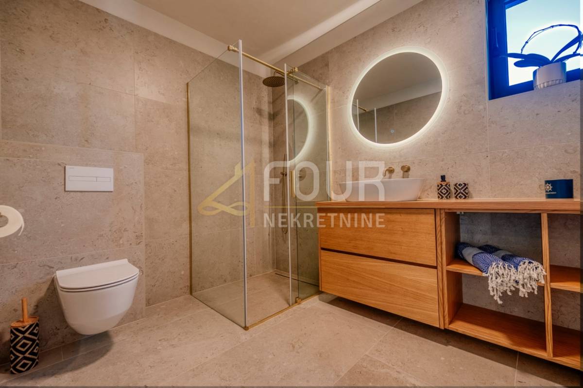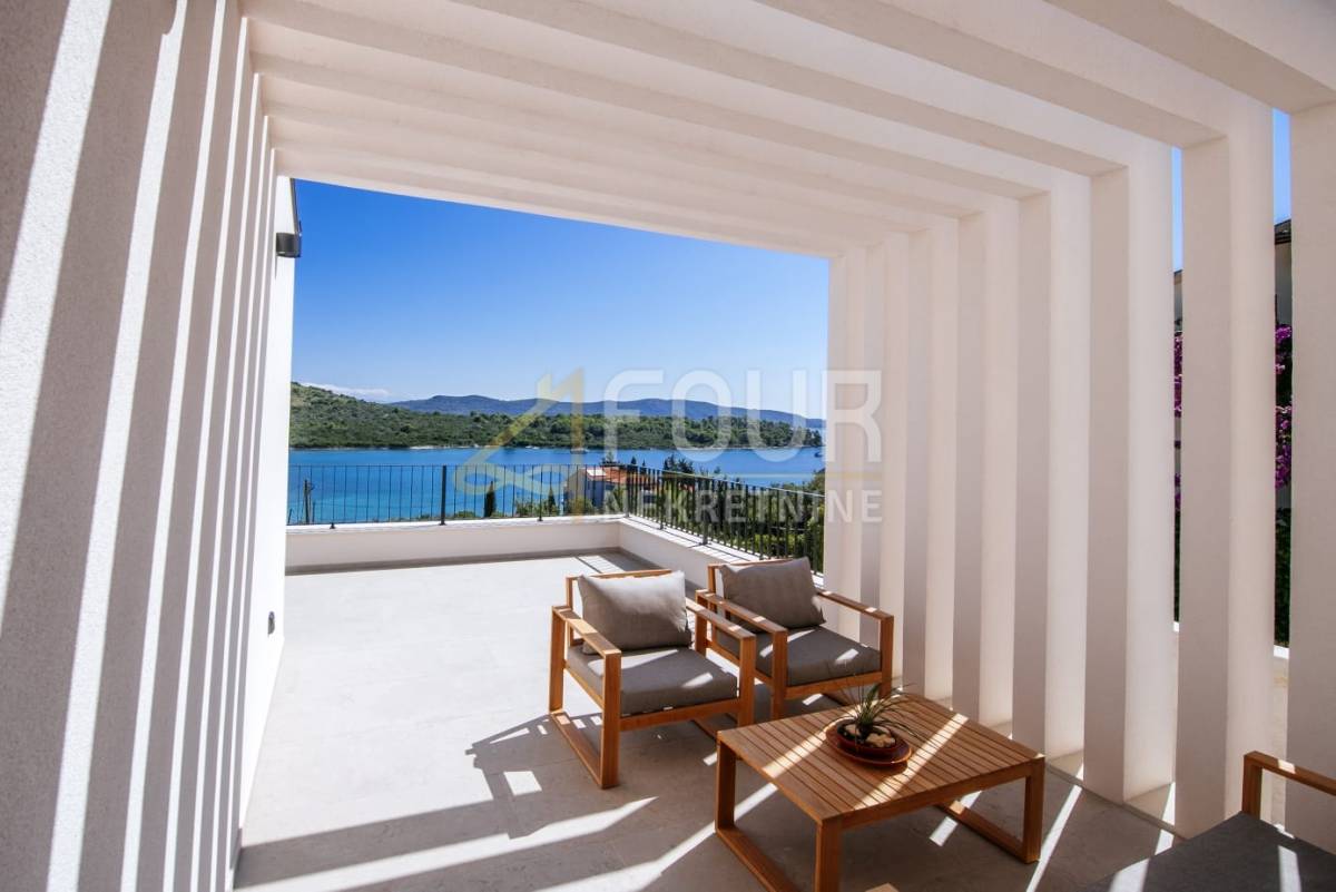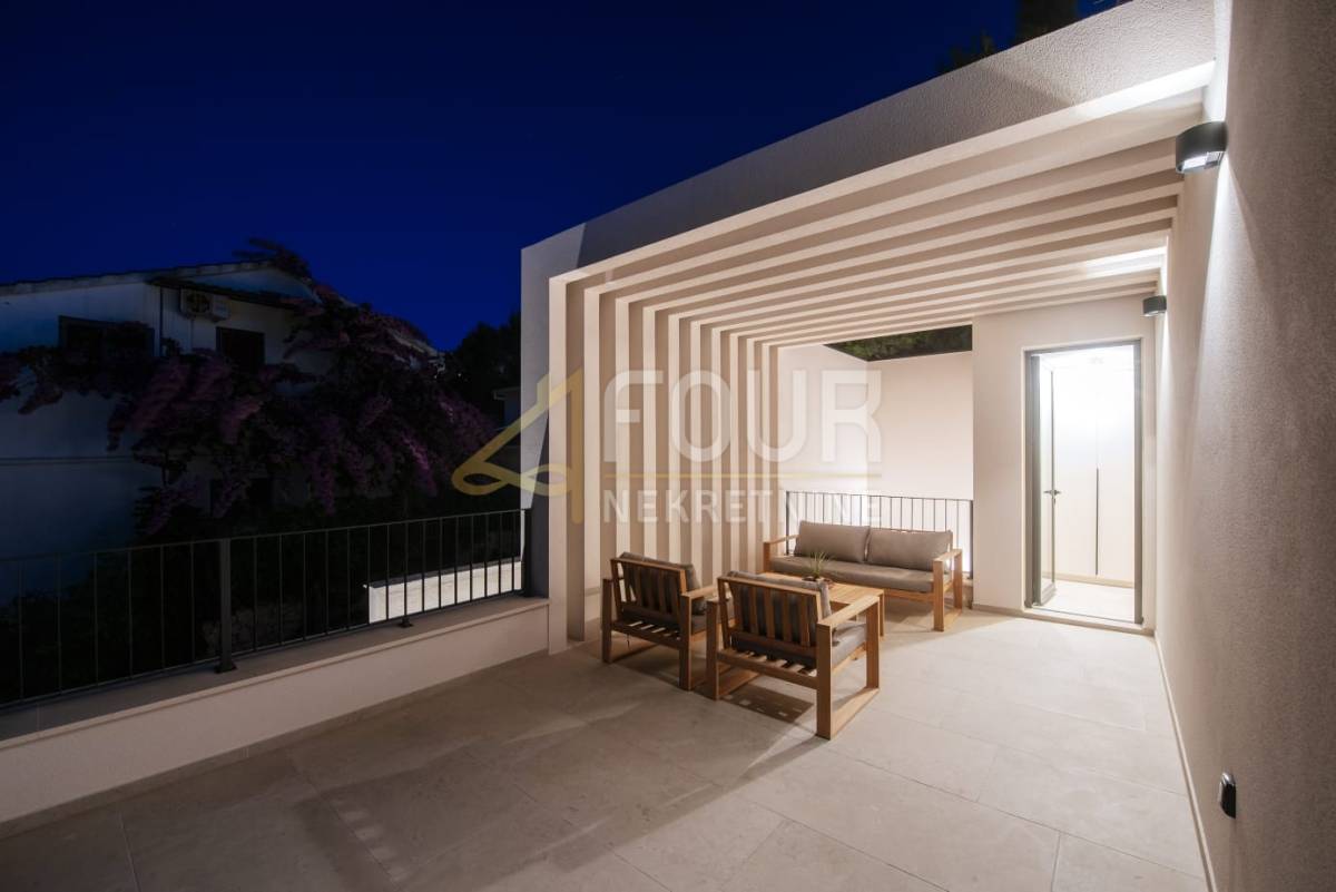 Prodaje se novoizgrađena samostojeća vila novije gradnje, smještena svega 90 metara od mora. Ova elegantna nekretnina pruža savršen spoj suvremenog dizajna, udobnosti i pogleda koji oduzima dah.