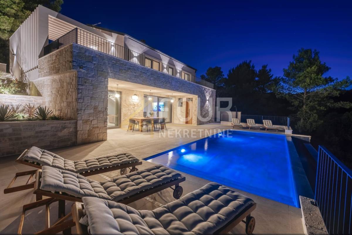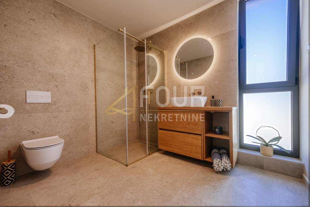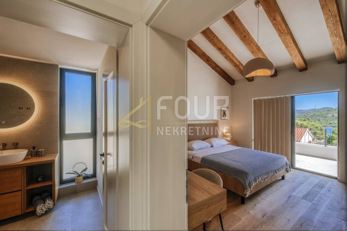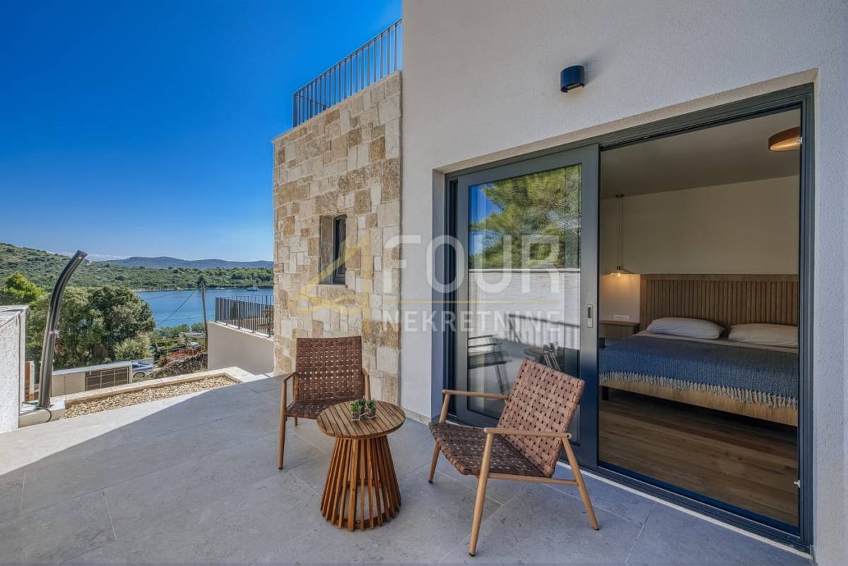 Prodaje se novoizgrađena samostojeća vila novije gradnje, smještena svega 90 metara od mora. Ova elegantna nekretnina pruža savršen spoj suvremenog dizajna, udobnosti i pogleda koji oduzima dah.