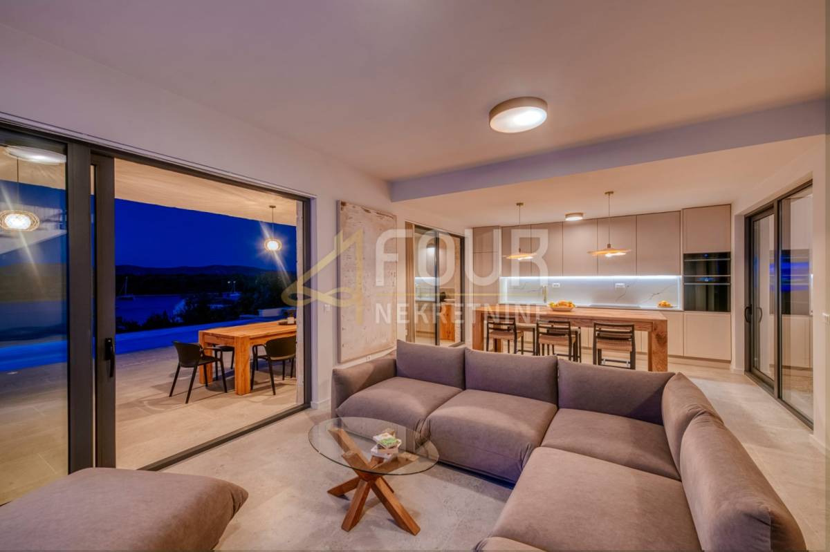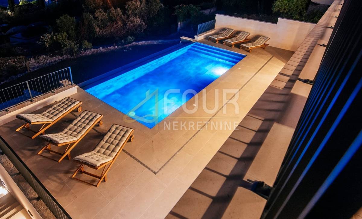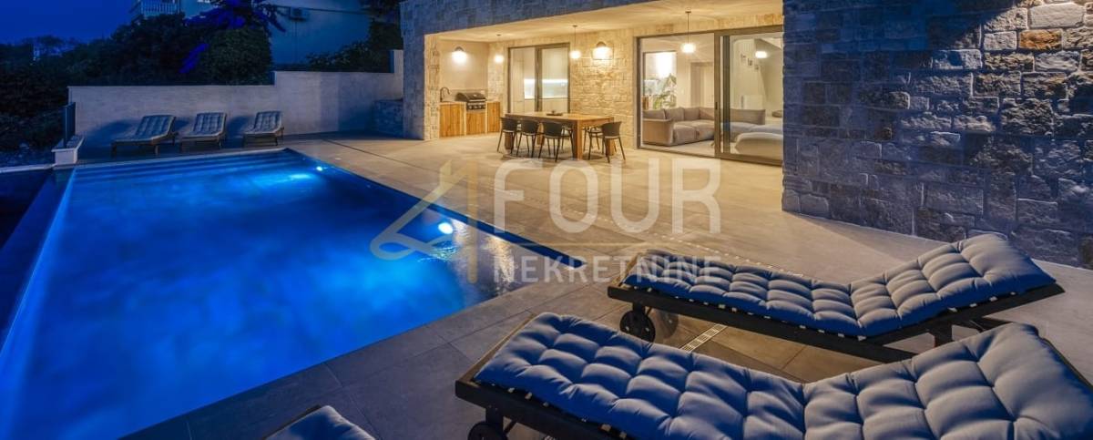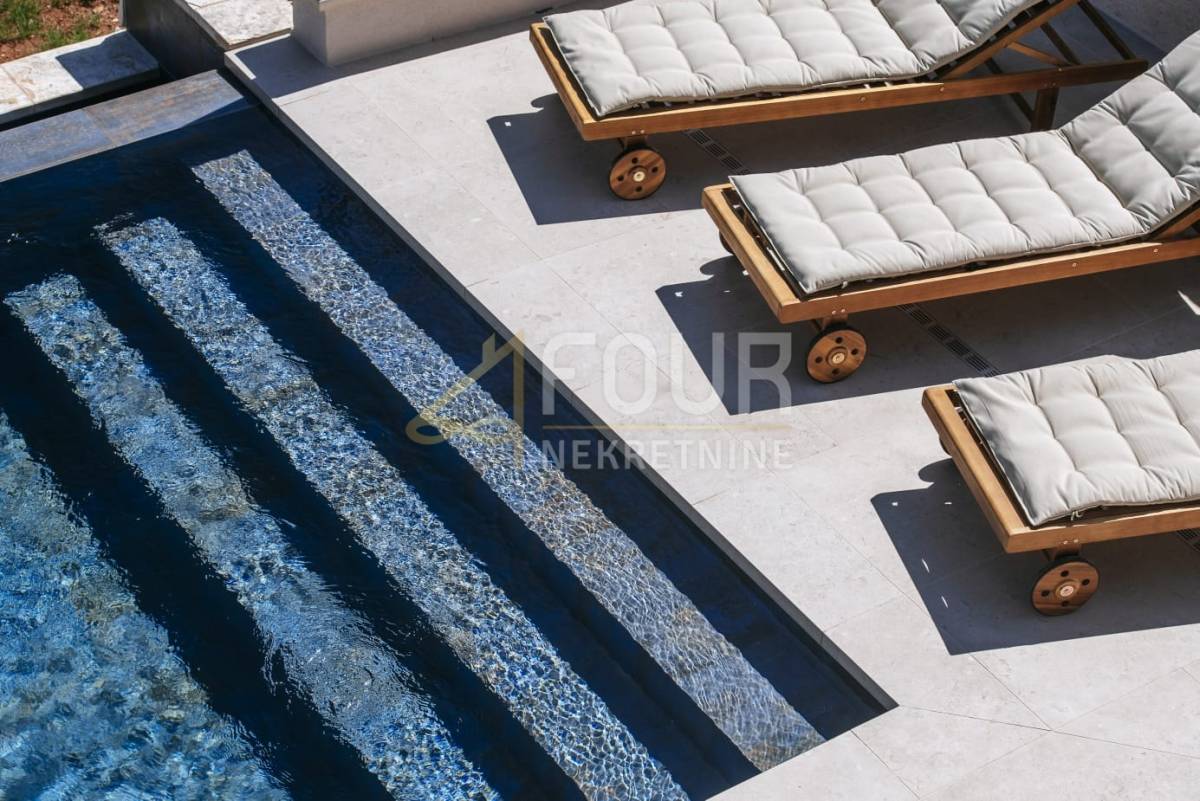 U vanjskom dijelu nalazi se grijani infinity bazen, ljetna kuhinja s plinskim roštiljem, vanjski tuš i uređeno sunčalište – savršeno mjesto za opuštanje i druženje. Vila je opremljena vrhunskim materijalima, podnim grijanjem na dizalicu topline i pažljivo osmišljenim detaljima koji naglašavaju luksuzan, ali funkcionalan stil života. Na raspolaganju je i privatno privezište za brod.