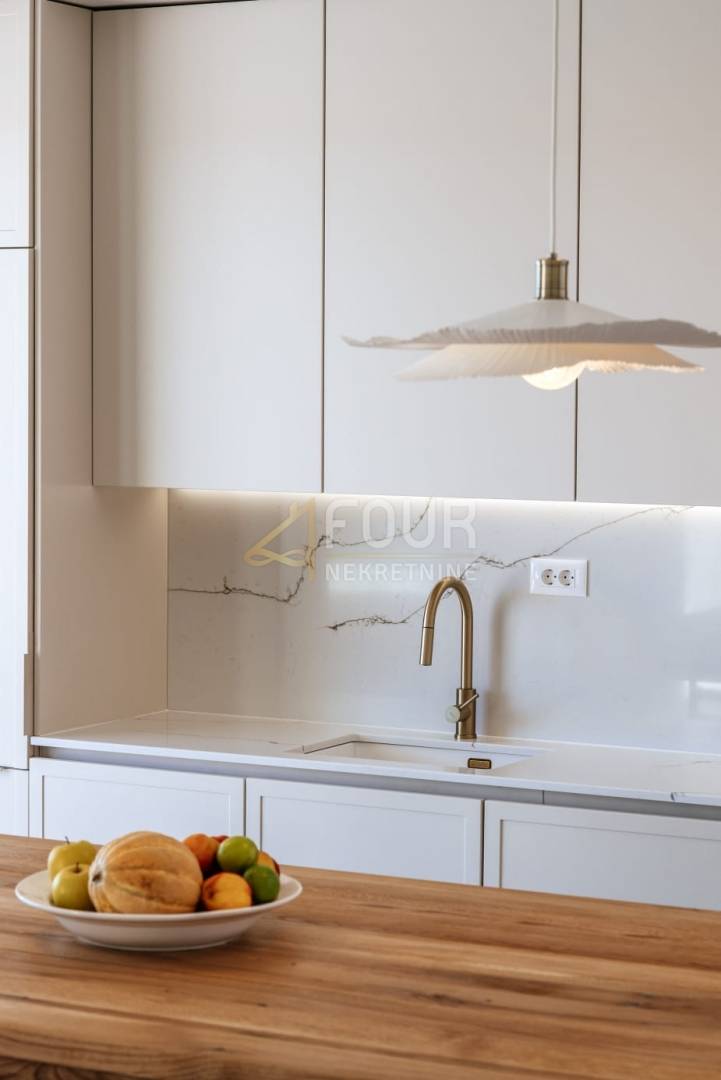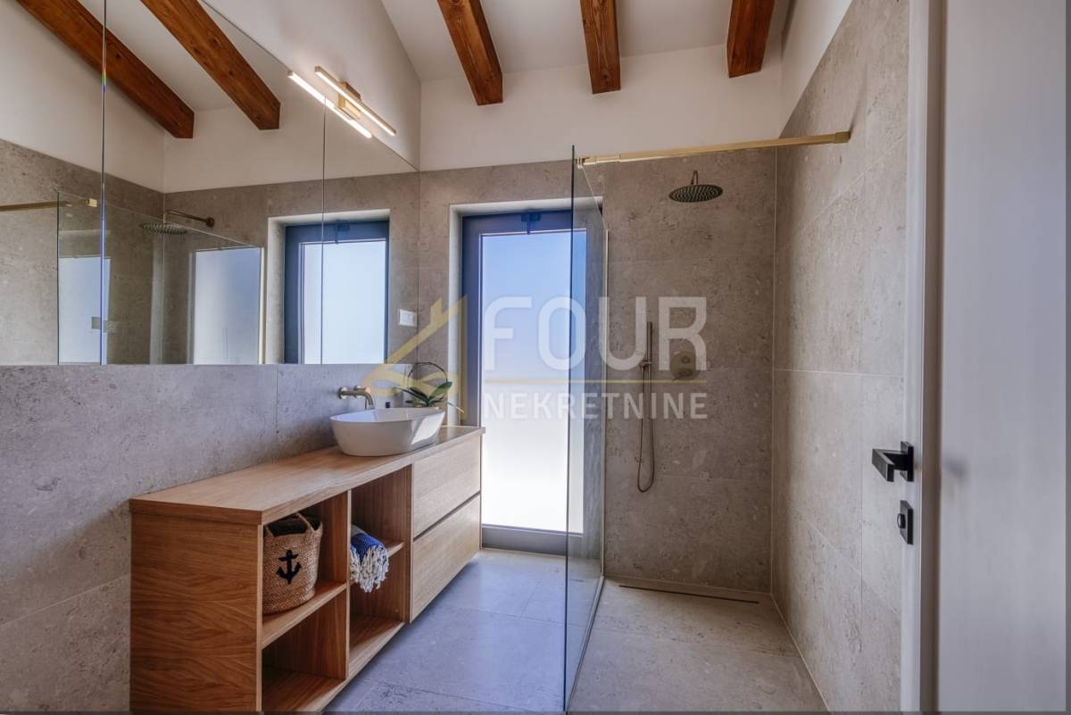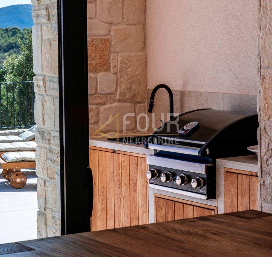 U vanjskom dijelu nalazi se grijani infinity bazen, ljetna kuhinja s plinskim roštiljem, vanjski tuš i uređeno sunčalište – savršeno mjesto za opuštanje i druženje. Vila je opremljena vrhunskim materijalima, podnim grijanjem na dizalicu topline i pažljivo osmišljenim detaljima koji naglašavaju luksuzan, ali funkcionalan stil života. Na raspolaganju je i privatno privezište za brod.