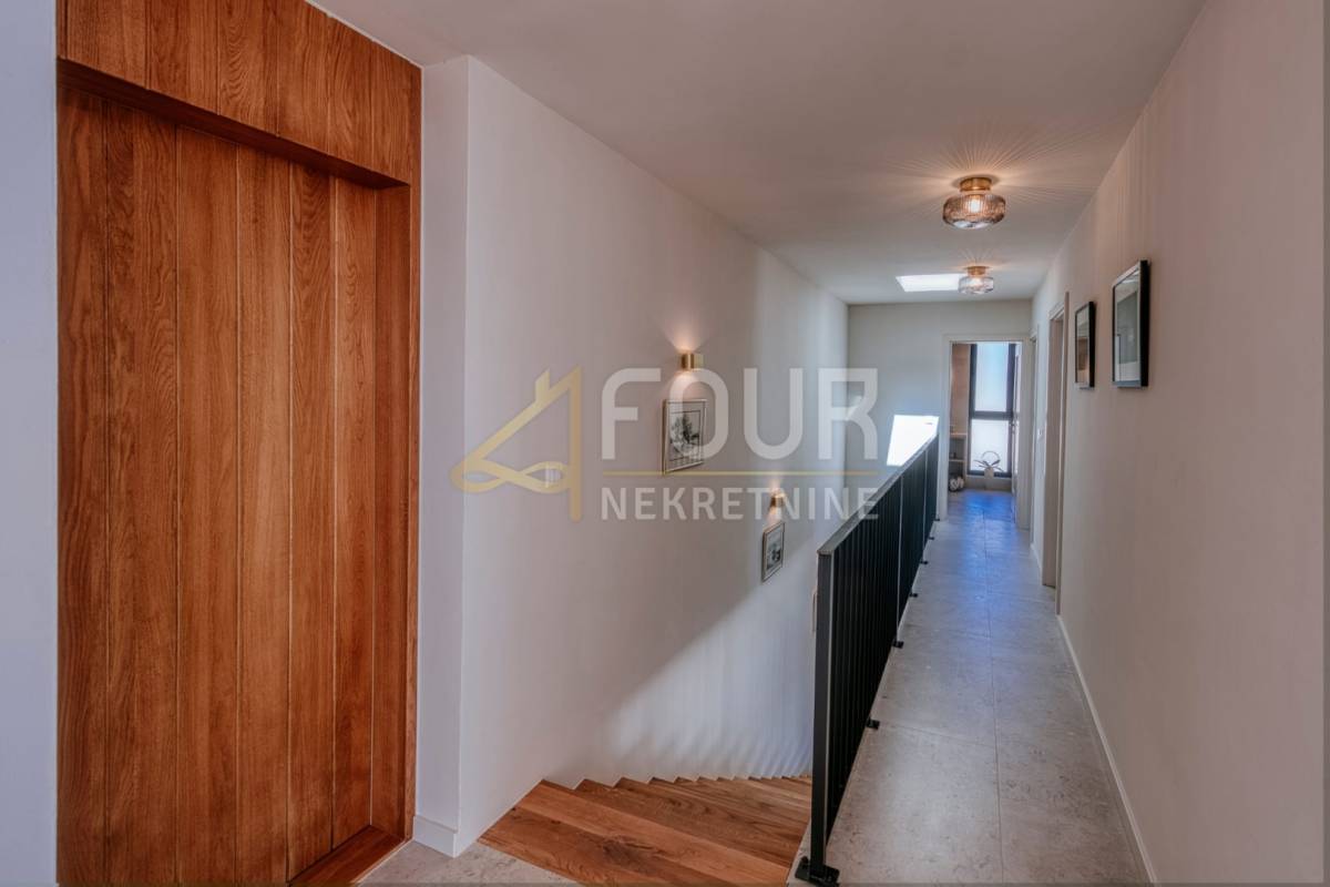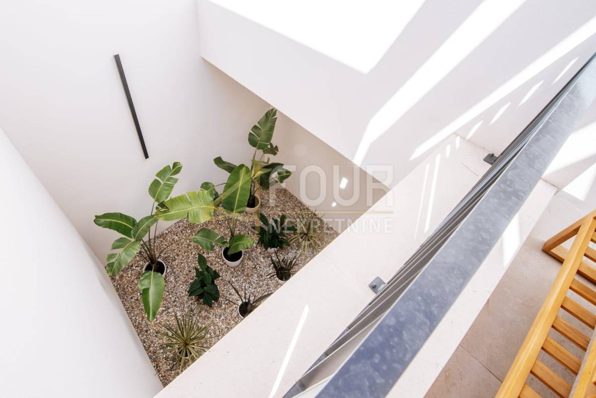 Vila se prostire na dvije etaže ukupne stambene površine od 294 m2, na parceli od 771 m2. U prizemlju se nalazi prostrani dnevni boravak s otvorenom kuhinjom i blagovaonicom, spavaća soba, ostava, unutarnji vrt, kupaonica, praonica te izlaz na veliku natkrivenu terasu sa sunčalištem. Na katu su dvije spavaće sobe, dvije moderne kupaonice, hodnik, terasa i balkon s panoramskim pogledom na more.