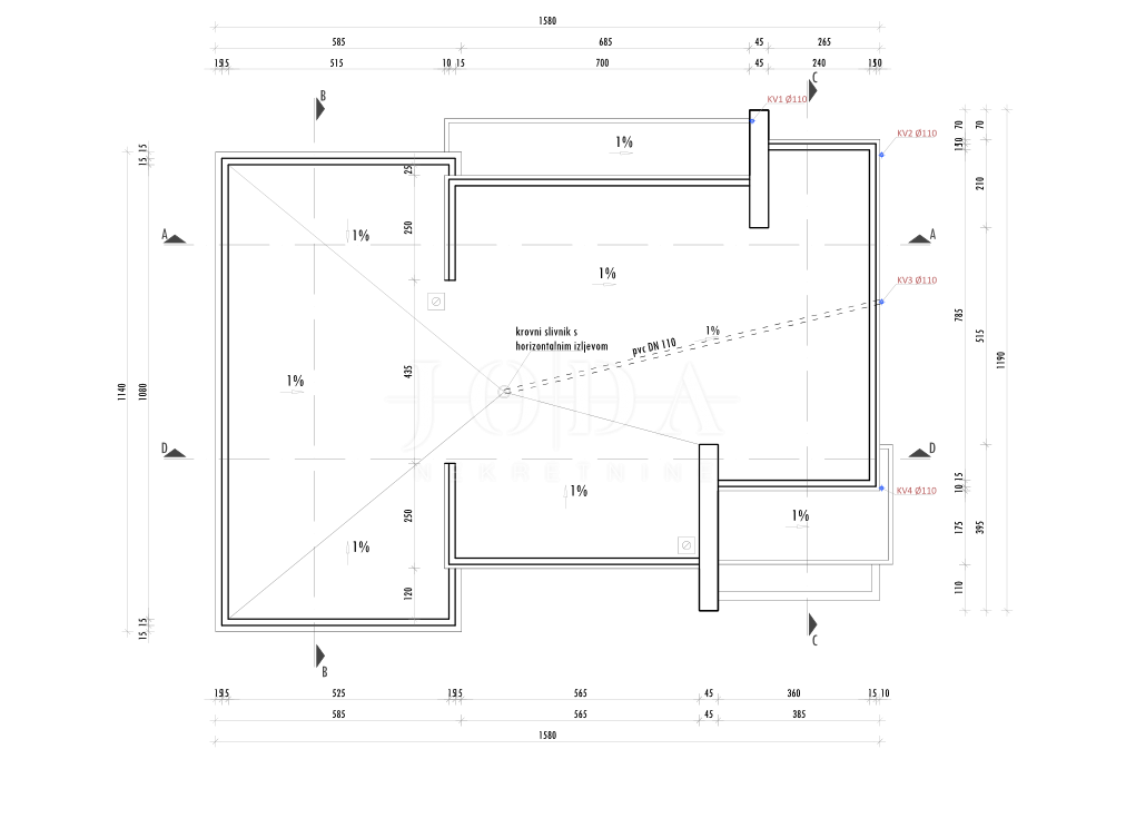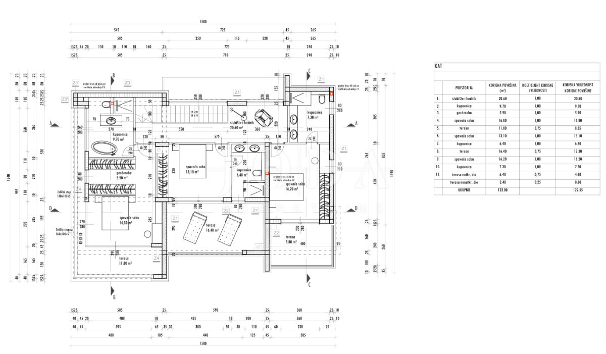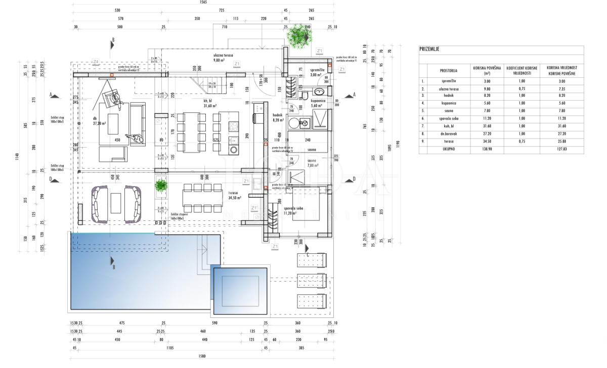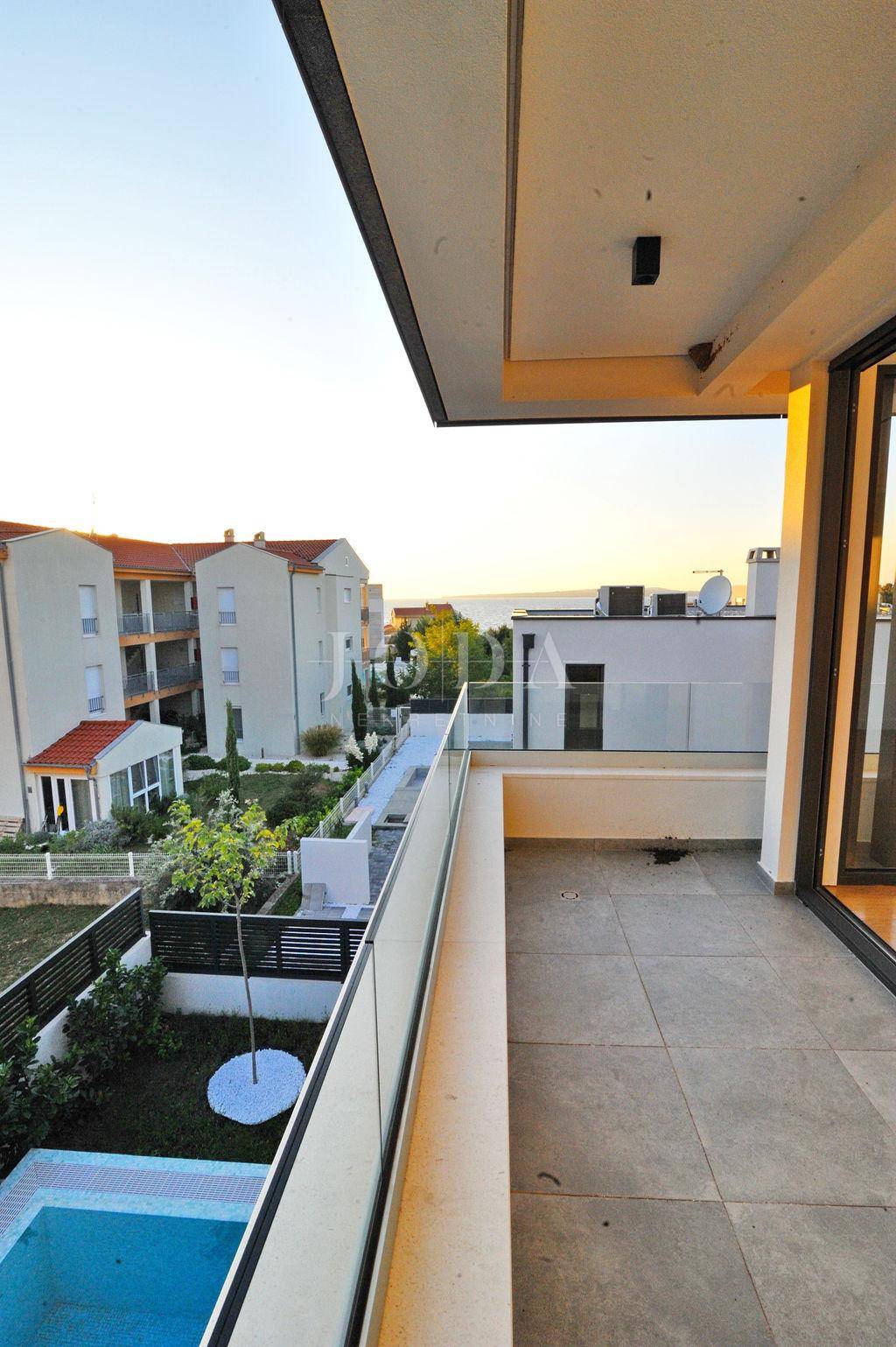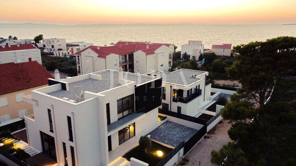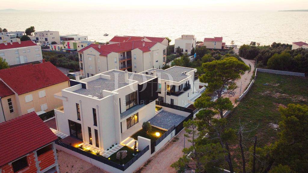 Prizemlje se sastoji od welnessa,kupaonice,spavaće sobe te iznimno velikog dnevnog boravka i kuhinje otvorenog koncepta.na katu su tri spavaće sobe svaka sa vlastitom kupaonicom i balkonima sa pogledom na more.