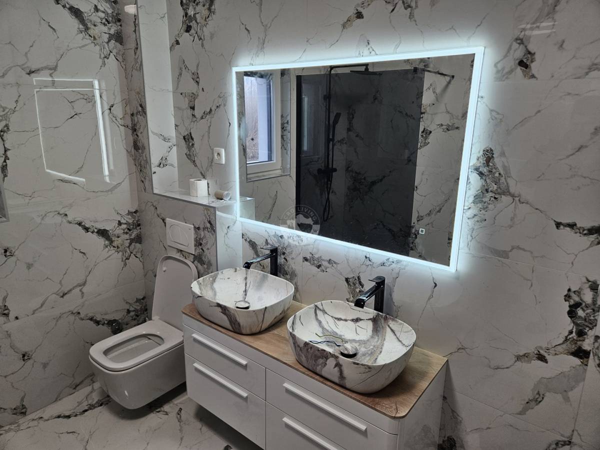 - Kupaone opremljene pločicama I klase, sa modernim namještajem, duplim umivaonicima, visećim toaletnim školjkama, ugradbenim vodokotlićem, walk in staklenom stijenom.