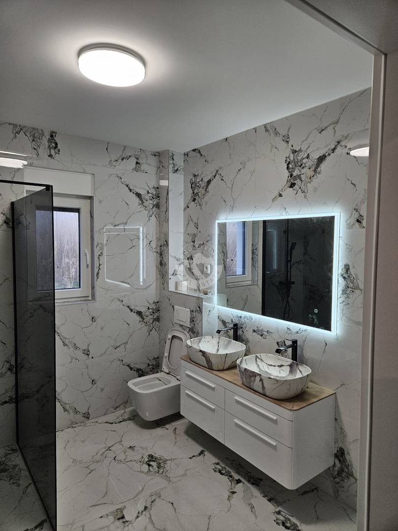 - Na podovima u kuhinji, dnevnom boravku i terasi stavljene su keramičke pločice ( I klasa ) dok su u spavaćim sobama na podovima SPC podne obloge.