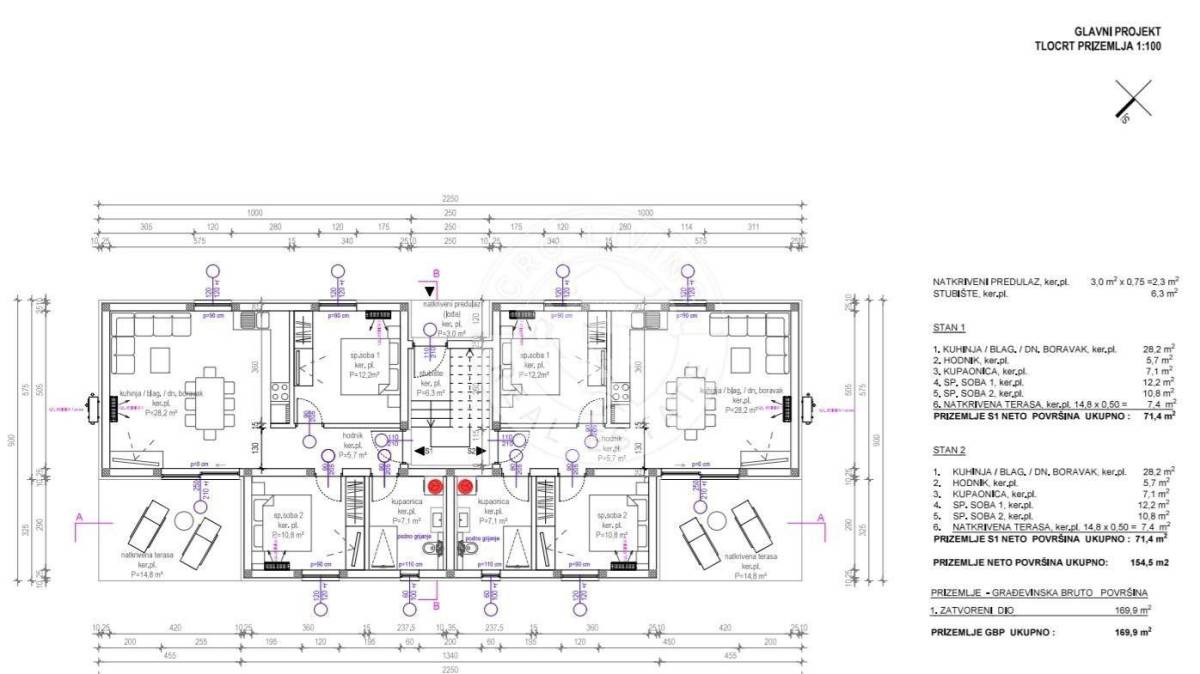 Stambeni objekt sa četiri stana izgrađena je na parceli od 620 m2 na kojoj je pozicionirana na središnjem dijelu, tako da se u dvorište ulazi sa dva kolna ulaza, na način da dva stana koriste jedan ulaz dok druga dva stana koriste drugi ulaz iz razloga da se postigne velika privatnost za vlasnike stanova.