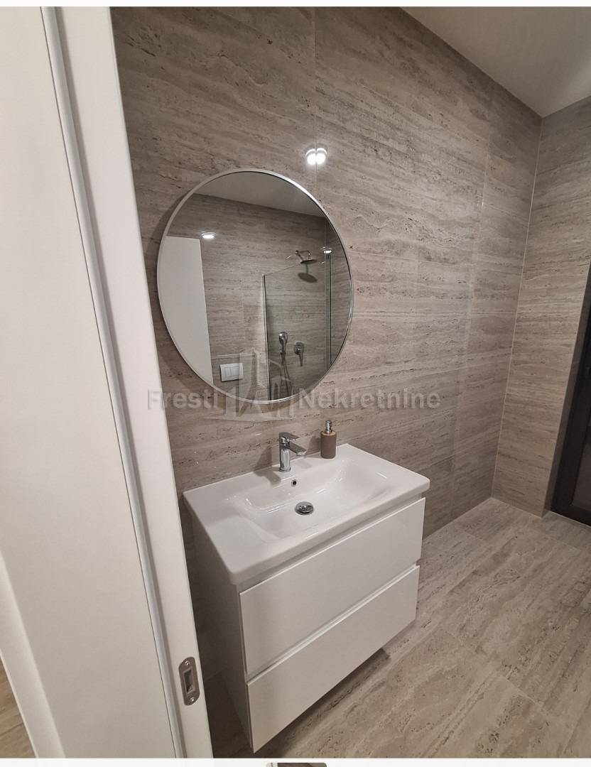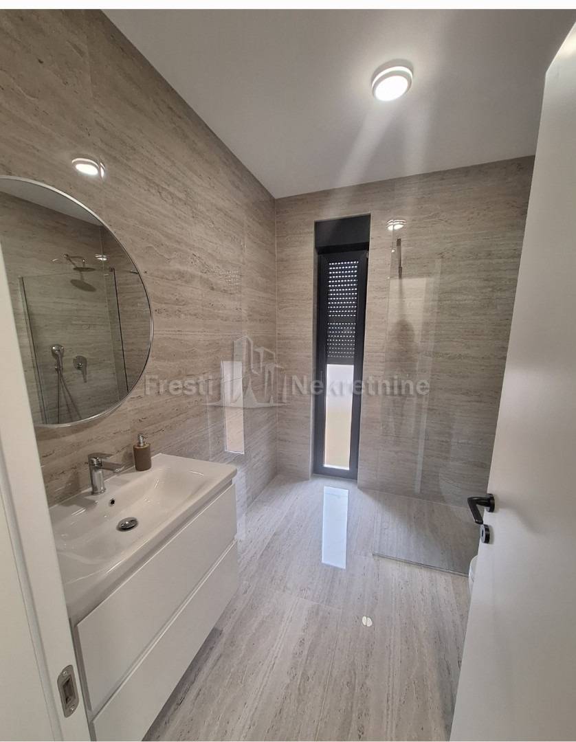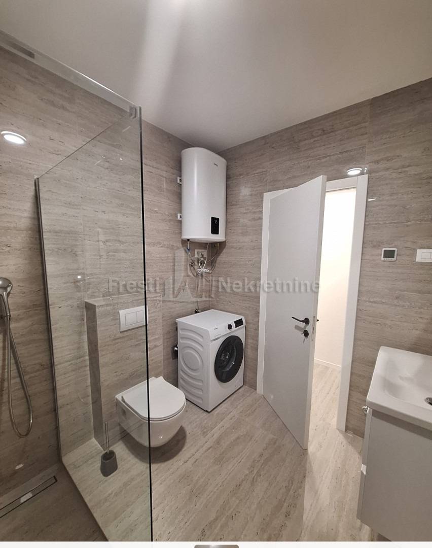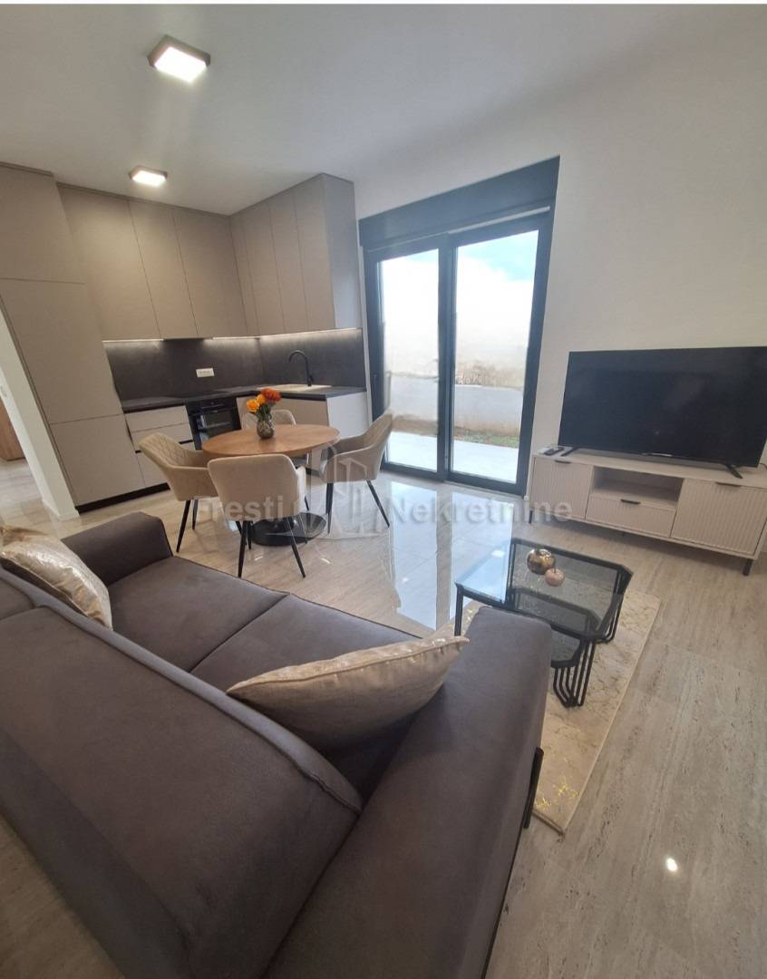 Tip: jednosoban, luksuzan, novogradnja, novoopremljen — 1 spavaća soba + dnevni boravak otvoren prema kuhinji i blagovaonici sa izlaskom na terasu s loggiom i nenatkrivenom terasom s vrtomProstran hodnikKupaonica: moderna, kompletno opremljenaTerasa: privatna, ozelenjena — mirna oaza za jutarnju kavu i ugodan odmorUdobnost: klima-uređaj i podno grijanje (za ugodne zimske večeri)Režije: posebno se plaćajuDostupnost: OdmahCijena: 1000 € / mjesečno (režije nisu uključene)