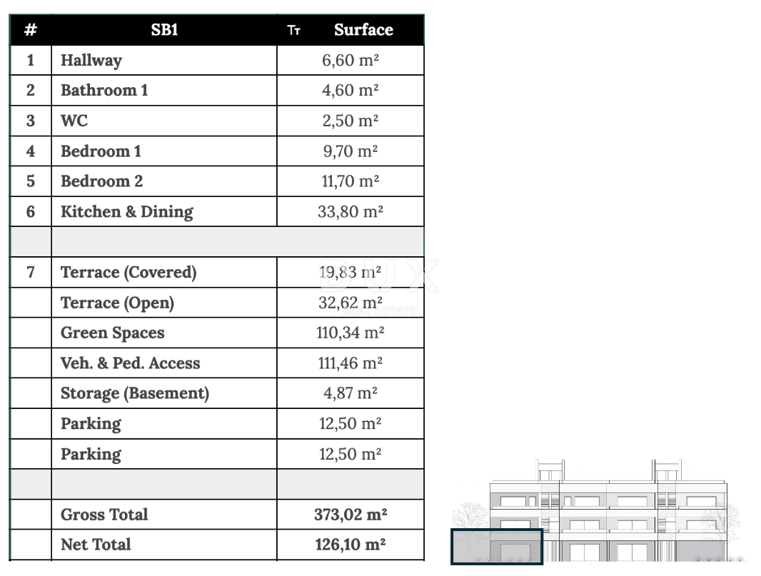 Stan SB1 smješten je u prizemlju i sastoji se od dvije spavaće sobe, jedne kupaonice, spremišta te prostranog dnevnog dijela s kuhinjom i blagovaonicom. Njegovu posebnu vrijednost čine veliki vrt, natkrivena terasa i dodatna nenatkrivena terasa.