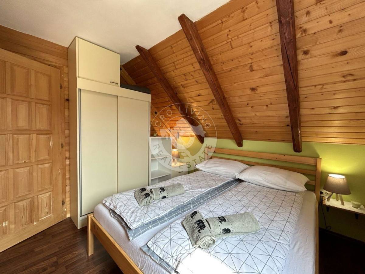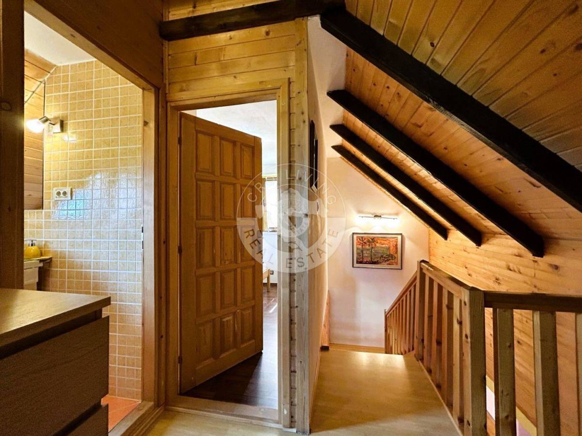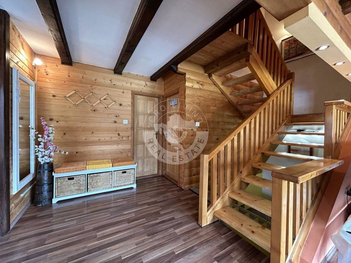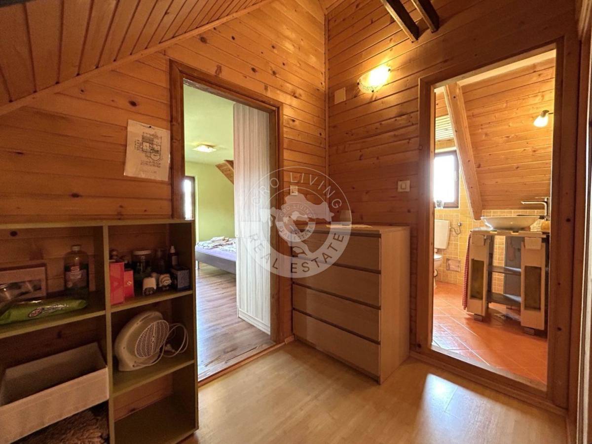 U 97 m2 netto površine drvenog dijela ( 117 m2 brutto ), u prizemlju su se smjestili dnevni boravak, blagovaonica i kuhinja sa izlazom na terasu, kupaonica i jedna spavaća soba, a u potkrovlju predsoblje, kupaonica i dvije spavaće sobe, od kojih jedna ima balkon.