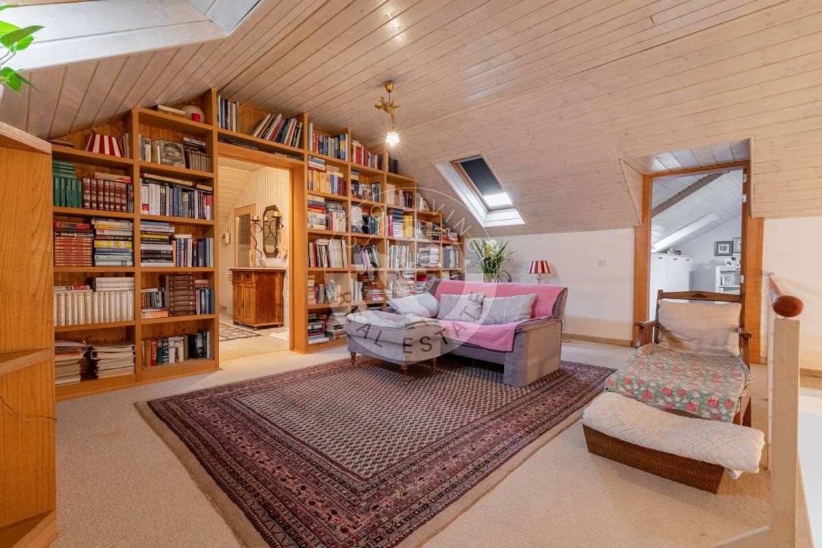 Na gornjem katu prostire se dodatna spavaća soba opremljena televizorom, udobna biblioteka koja poziva na opuštanje uz omiljenu knjigu, te sauna koja pruža prostor za potpuno opuštanje i wellness doživljaj.