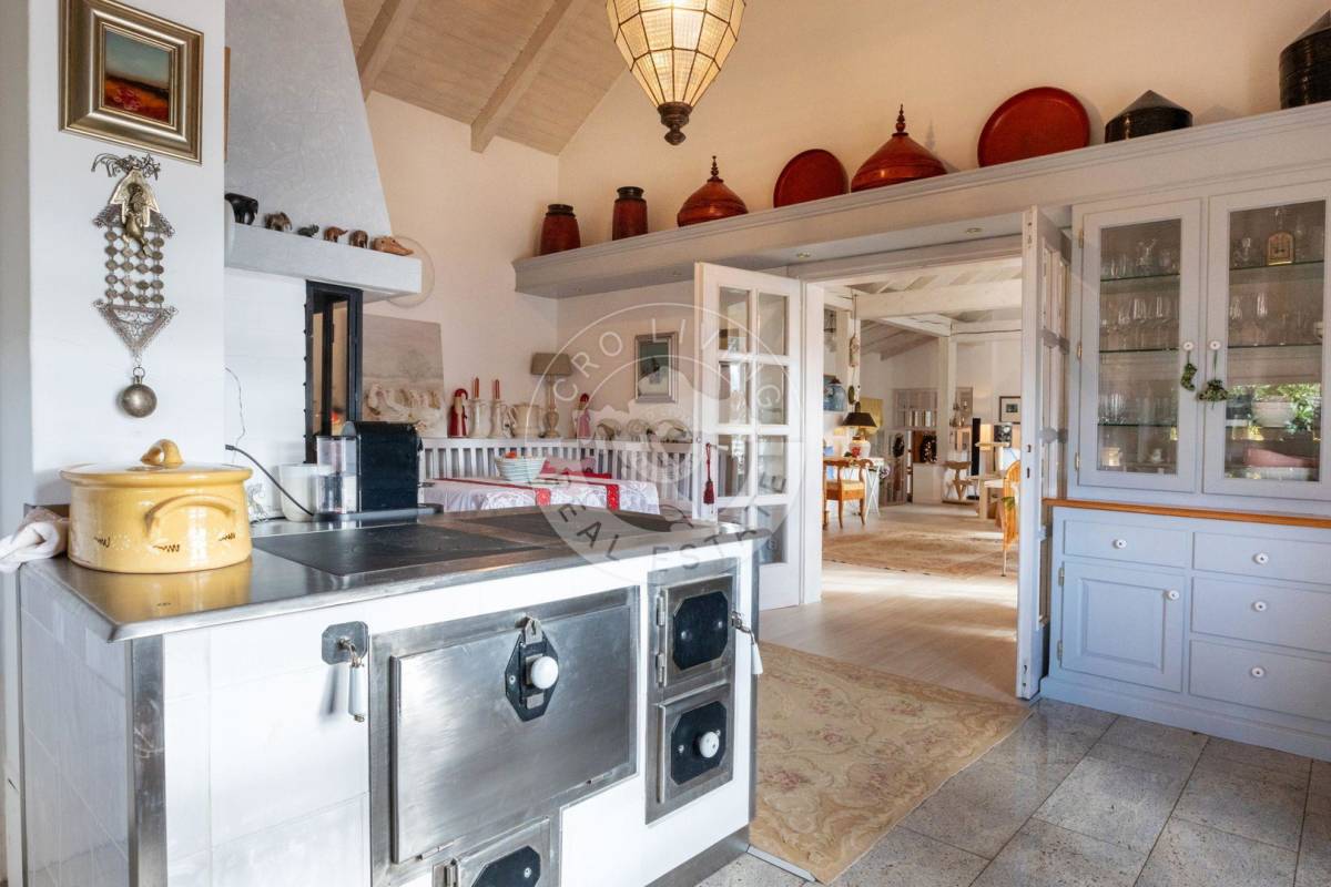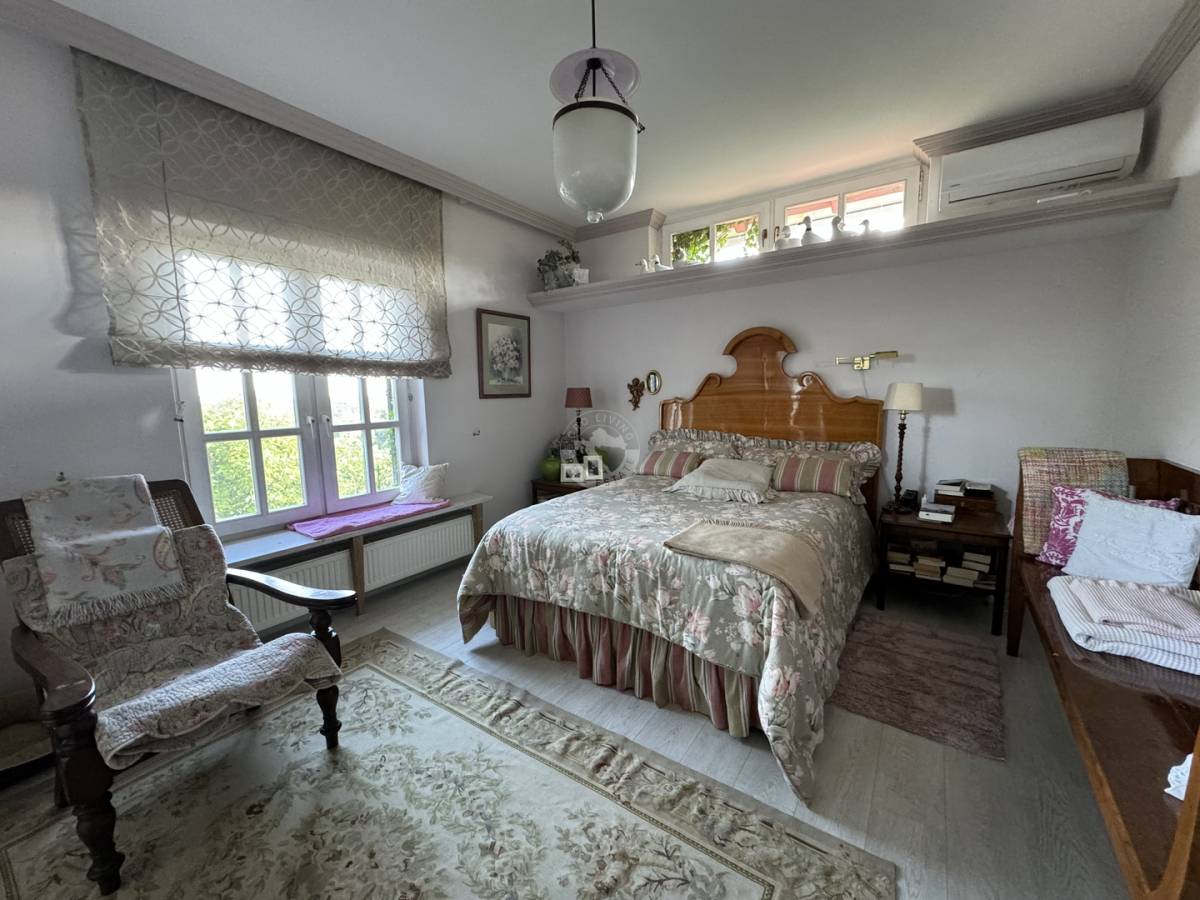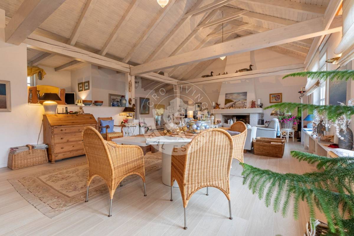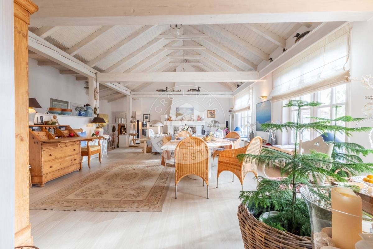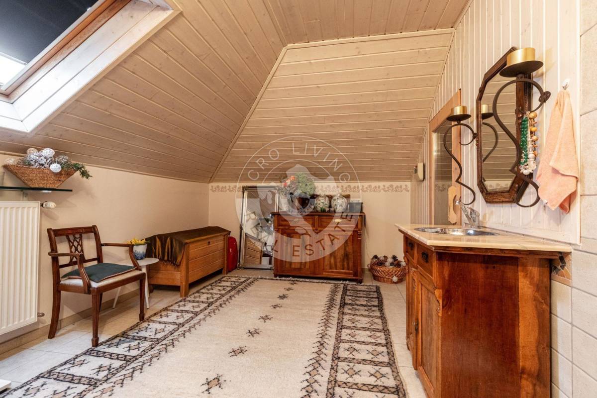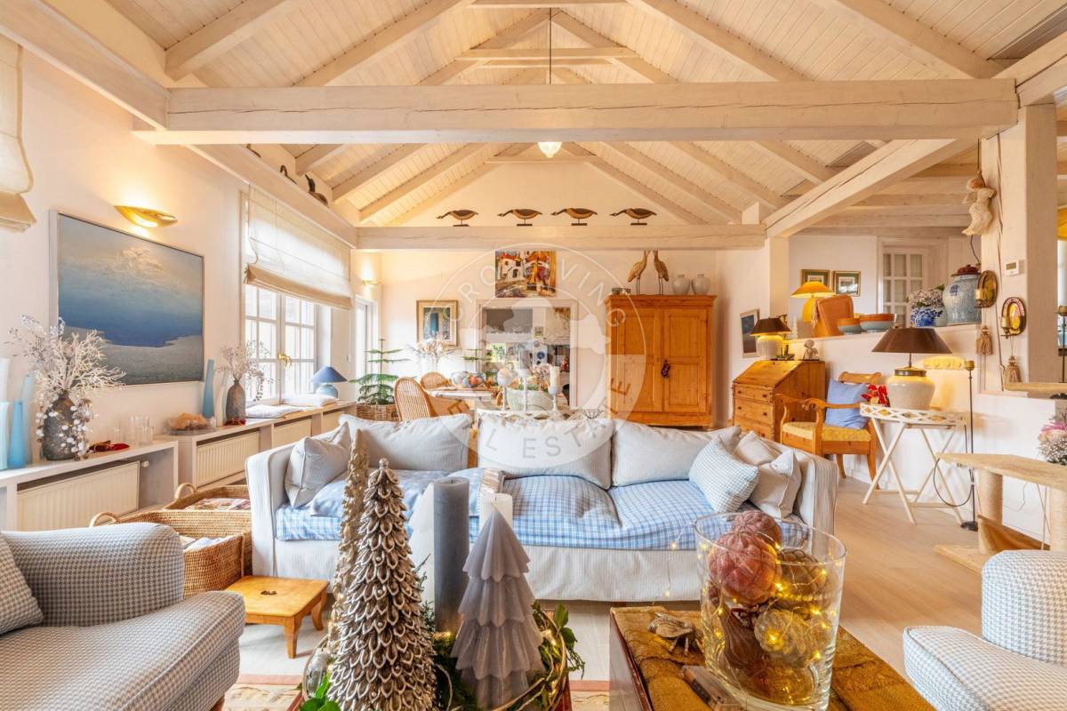 Prizemlje ove impozantne vile krasi prostrani dnevni boravak ispunjen prirodnim svjetlom, s izlazom na terasu. Visoki stropovi s drvenim gredama naglašavaju autentičnost i šarm kuće, dok je kamin, kao središnji element prostora, zadužen za dodatnu toplinu i ugodu.