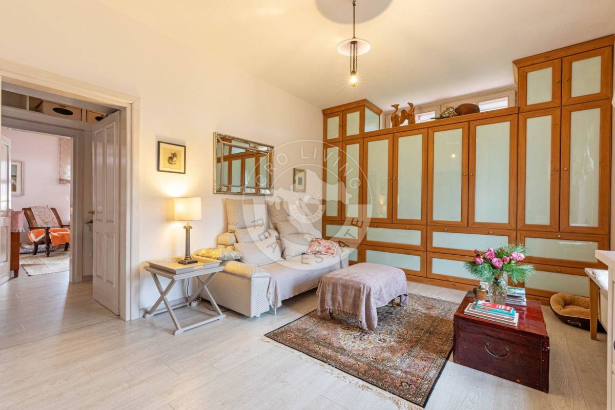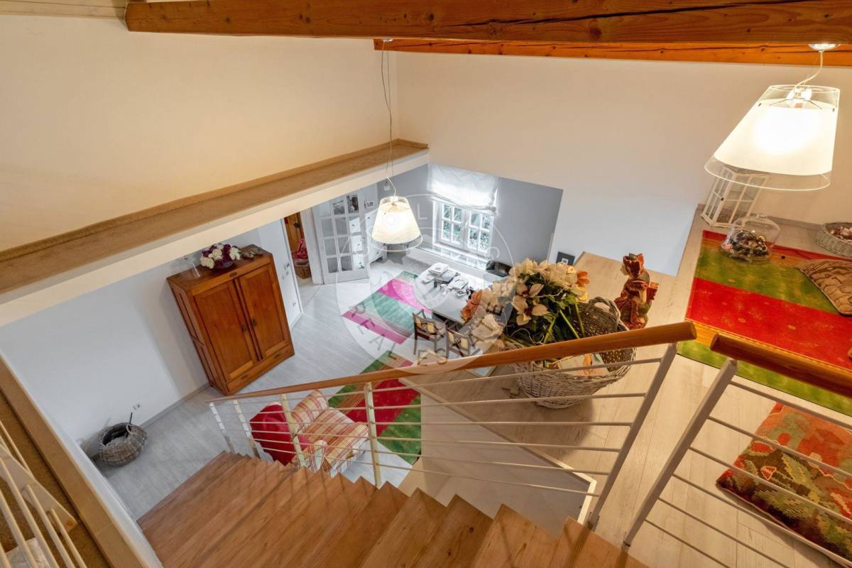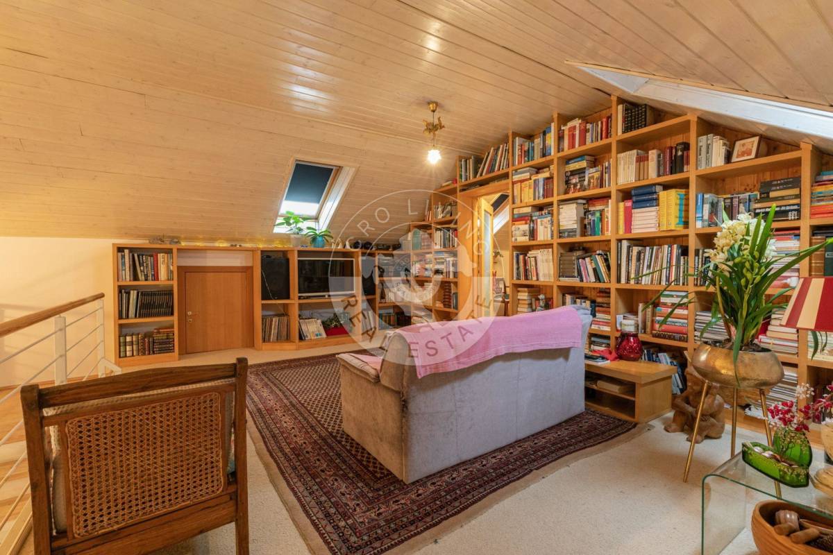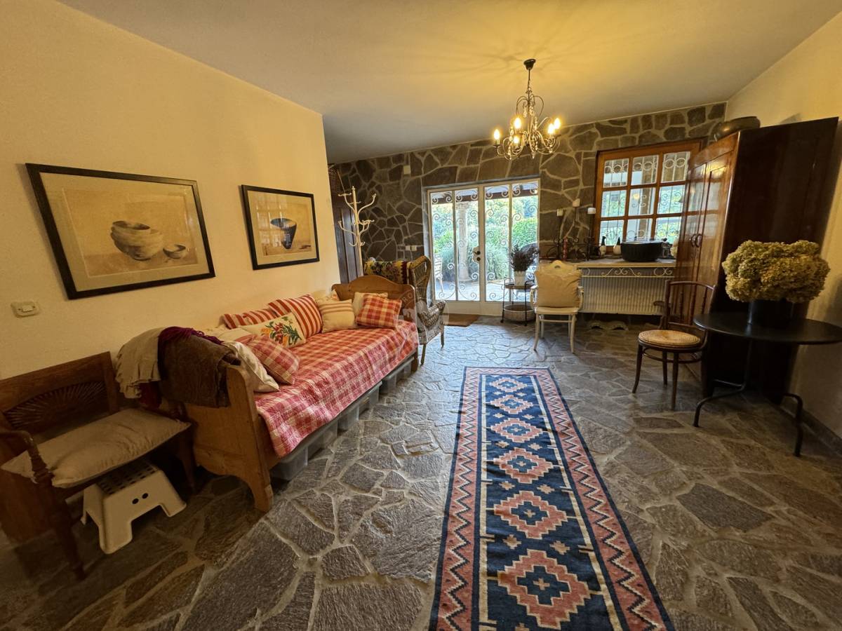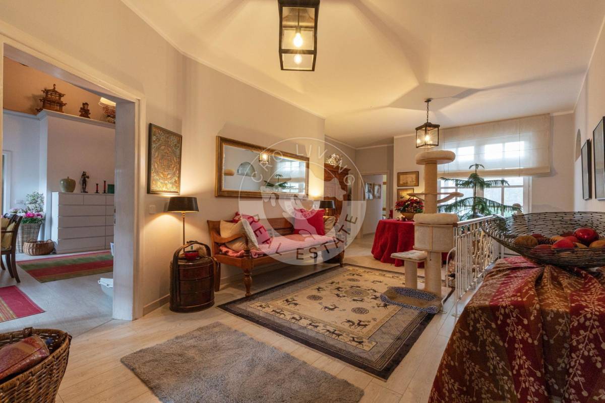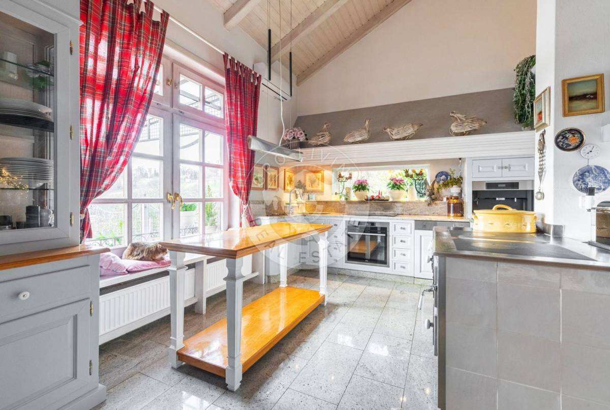 Prizemlje ove impozantne vile krasi prostrani dnevni boravak ispunjen prirodnim svjetlom, s izlazom na terasu. Visoki stropovi s drvenim gredama naglašavaju autentičnost i šarm kuće, dok je kamin, kao središnji element prostora, zadužen za dodatnu toplinu i ugodu.