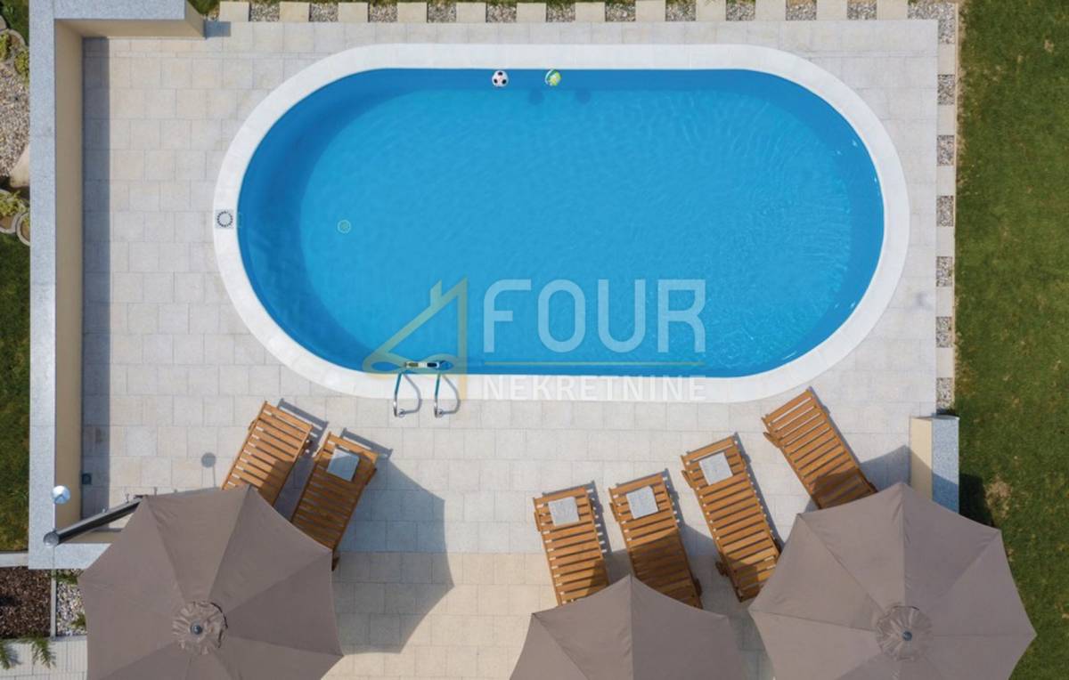 Eksterijer je prava mala oaza mira – velika okućnica s pažljivo održavanim travnjakom, vrtom, bazenom zapremine 45 m³, roštiljem, sunčalištem i dječjim igralištem.