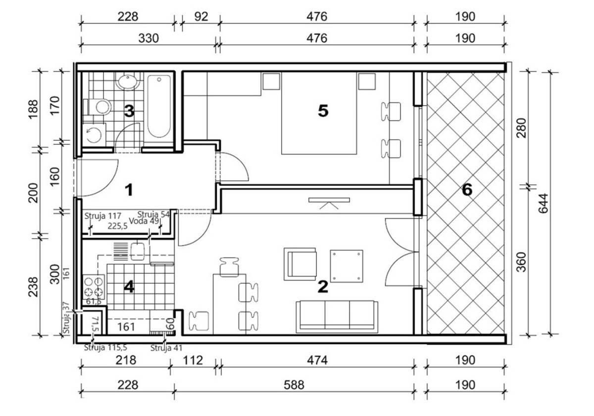 Stan se sastoji od hodnika, open space kuhinje s blagovaonom i dnevnim boravskom s izlazom na loggiu, spavaće sobe te kupaonice.