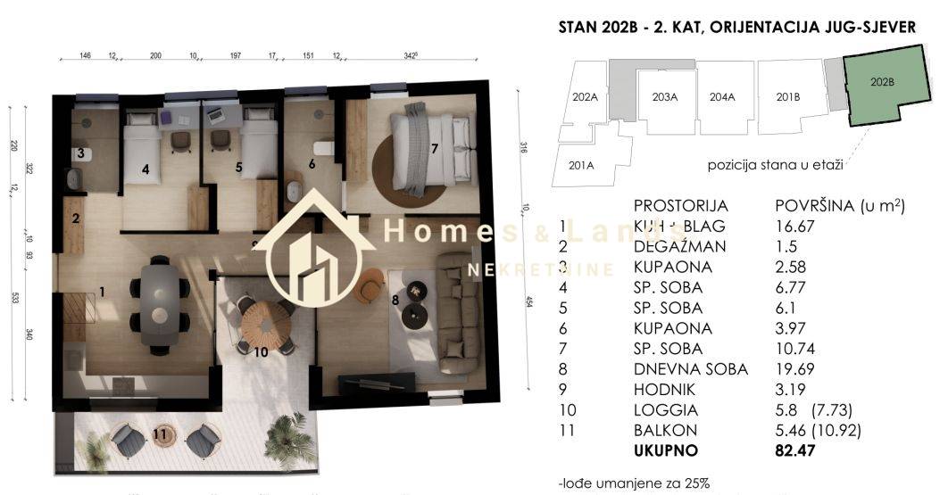 ČETVEROSOBAN STAN stan površine 82,47m2(102B,202B) na 1. katu A zgrade, orijentiran istok-zapad sastoji se od ulaznog hodnika, kuhinje s blagovaonicom, dnevnog boravka, tri spavaće sobe, dvije kupaonice i prostranog balkona