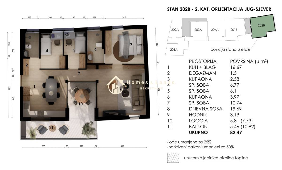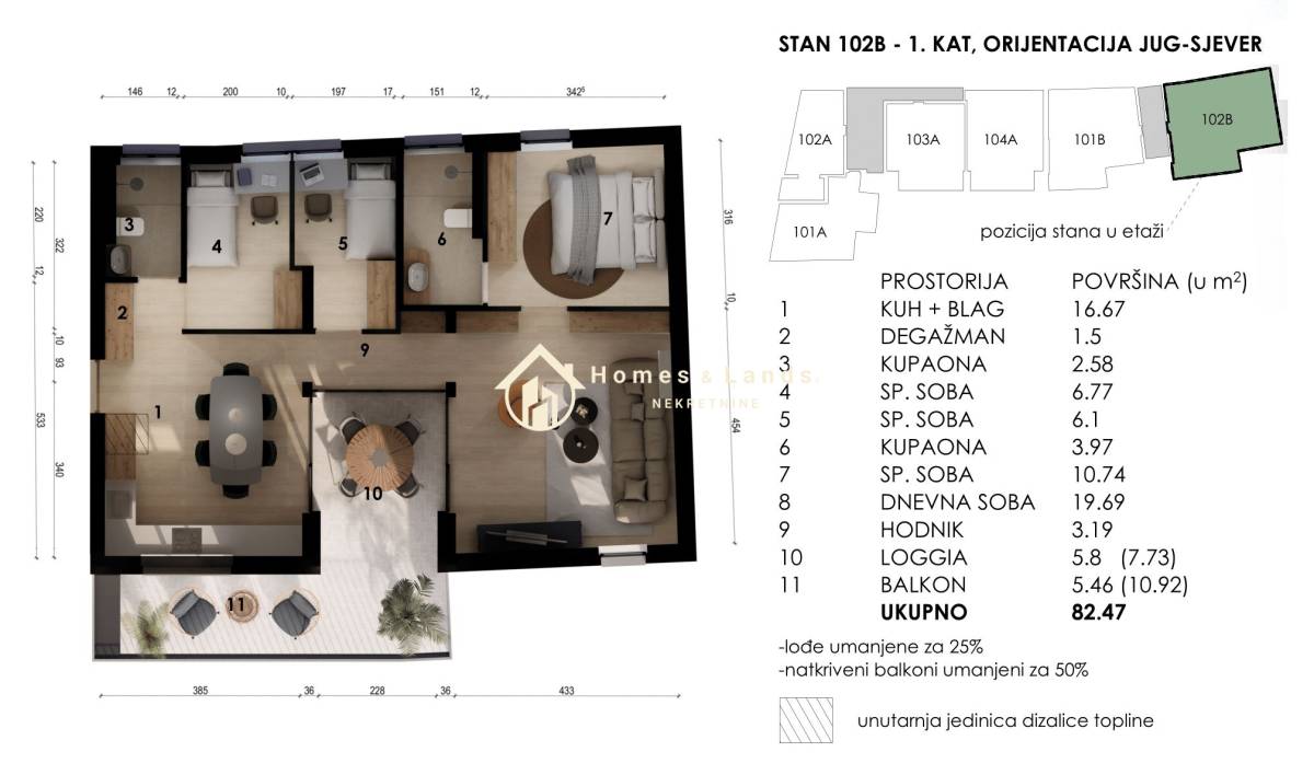 ČETVEROSOBAN STAN stan površine 82,47m2(102B,202B) na 1. katu A zgrade, orijentiran istok-zapad sastoji se od ulaznog hodnika, kuhinje s blagovaonicom, dnevnog boravka, tri spavaće sobe, dvije kupaonice i prostranog balkona.