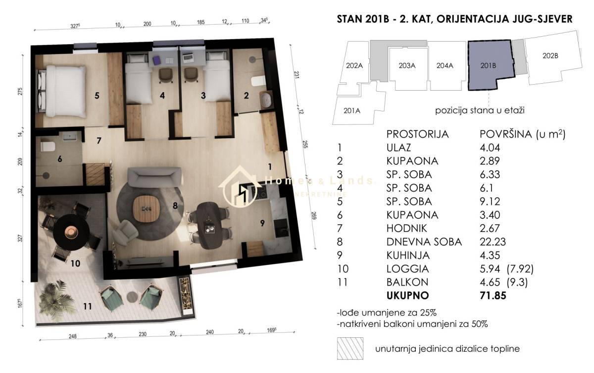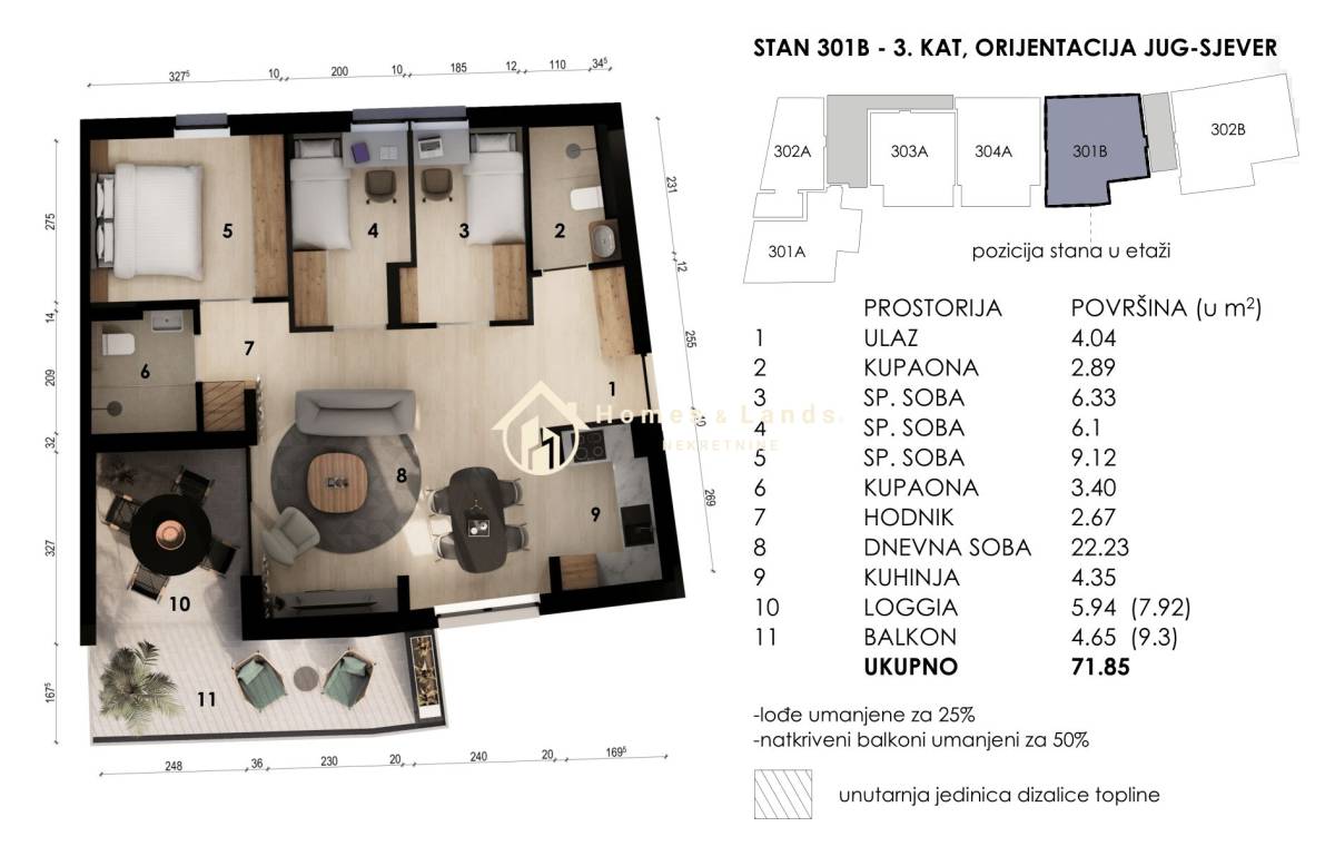 ČETVERSOBAN STAN stan površine 71,85 m2 (201B I 301B 1 kat) na 2. katu B zgrade, orijentiran istok-zapad sastoji se od ulaznog hodnika, kuhinje s blagovaonicom, dnevnog boravka, tri spavaće sobe, dvije kupaonice i prostranog balkona.