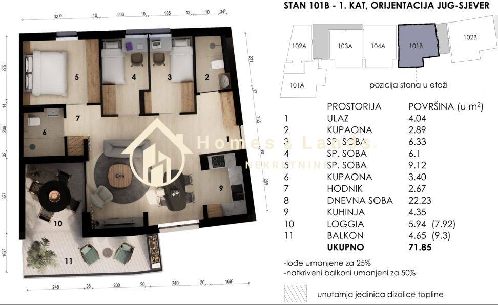 ČETVEROSOBAN STAN stan površine 71,85 m2 (101B) na 1. katu B zgrade, orijentiran istok-zapad sastoji se od ulaznog hodnika, kuhinje s blagovaonicom, dnevnog boravka, tri spavaće sobe, dvije kupaonice i prostranog balkona.