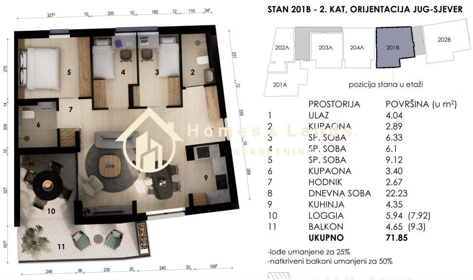 ČETVERSOBAN STAN stan površine 71,85 m2 (101B I 201B 1 kat) na 2. katu B zgrade, orijentiran istok-zapad sastoji se od ulaznog hodnika, kuhinje s blagovaonicom, dnevnog boravka, tri spavaće sobe, dvije kupaonice i prostranog balkona.