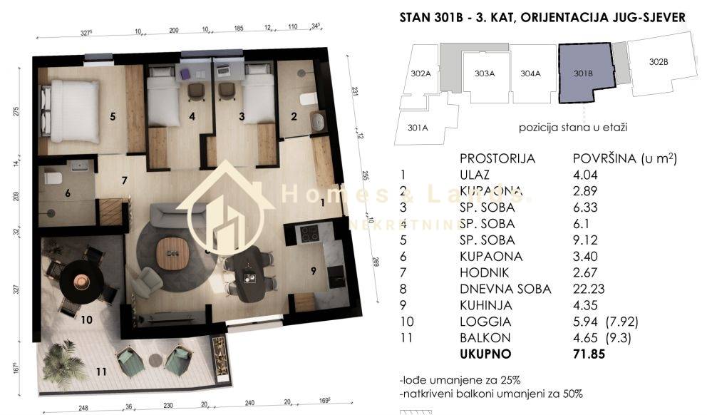 ČETVEROSOBAN STAN stan površine 71,85 m2 (301B) na 3. katu B zgrade, orijentiran istok-zapad sastoji se od ulaznog hodnika, kuhinje s blagovaonicom, dnevnog boravka, tri spavaće sobe, dvije kupaonice i prostranog balkona.