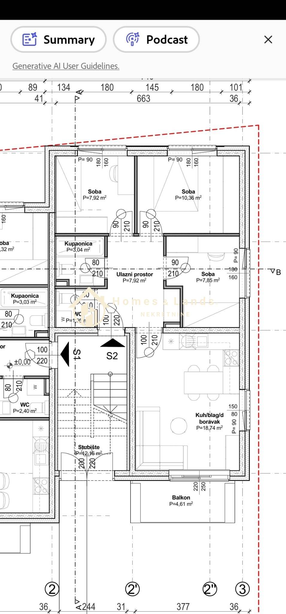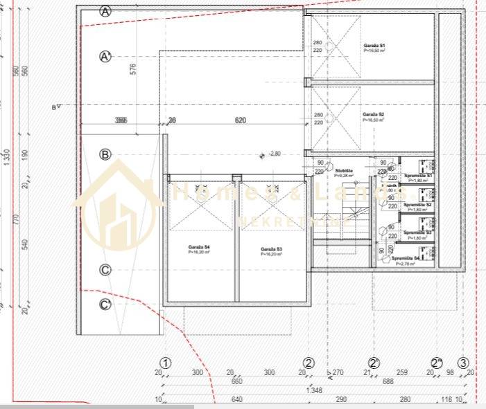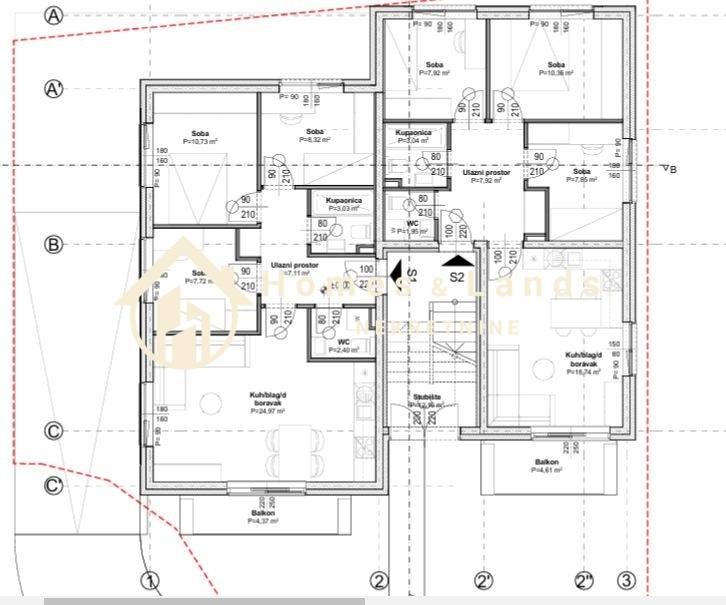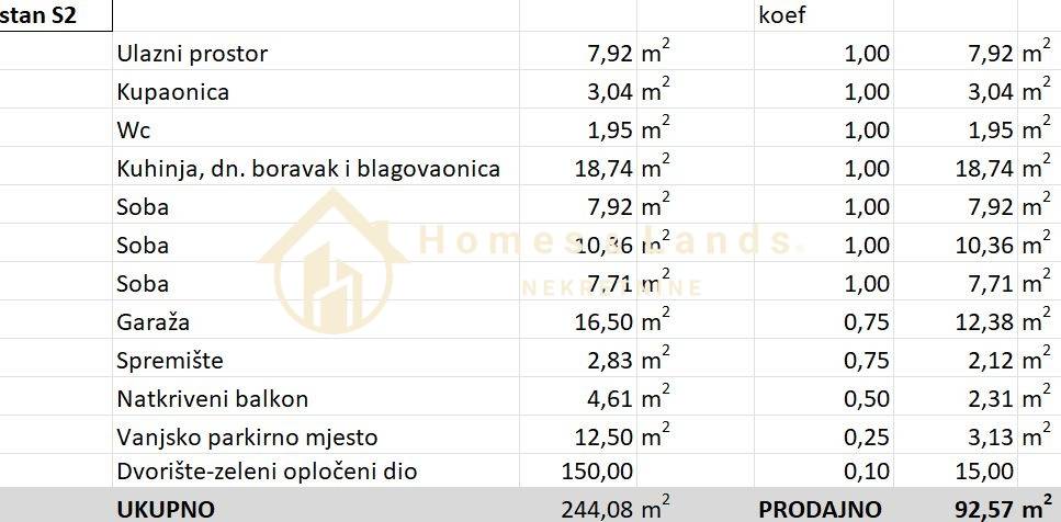 Stan S2 na prizemlju zgrade P4,korisne površine 244,04m2, obračunske 92,57 m2 sastoji se od ulaznog hodnika,kuhinje s blagovaonicom i dnevnog boravka,kupaonice,velike terase,tri komforne spavaće sobe, kupaonice,wc-a,dvorišta s vrtom i zelenom površinom garaže na -1 etaži ,spremišta te vanjskog parkinga.
