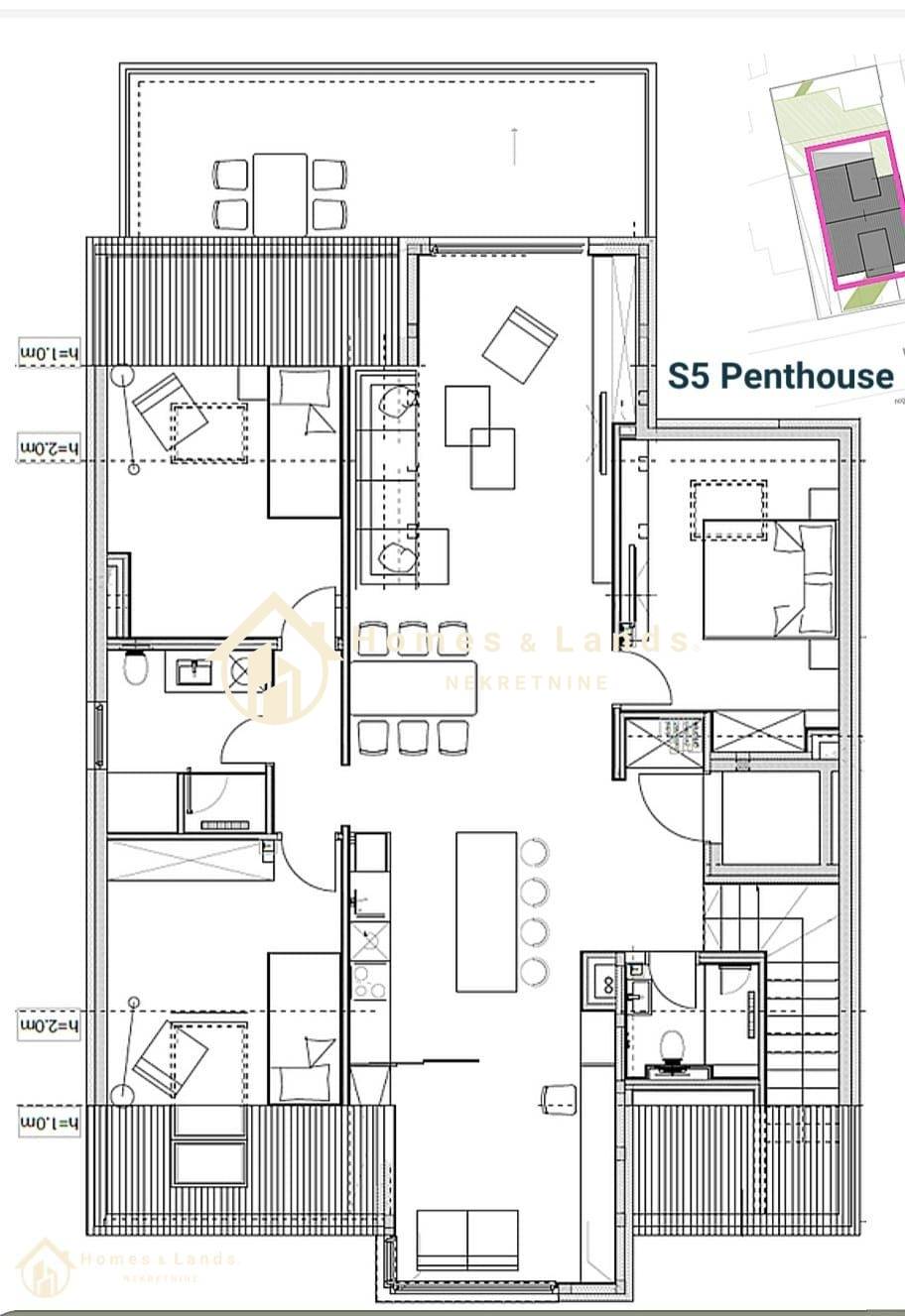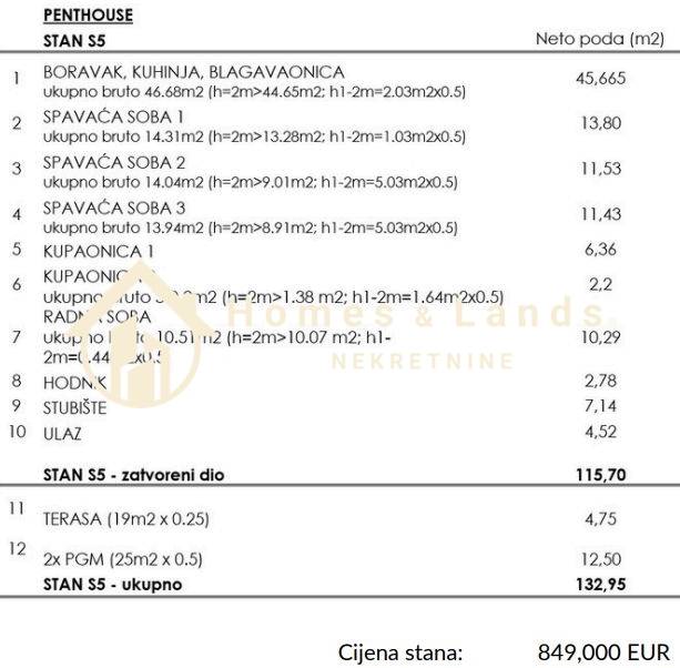 Stan S5 -penthouse obračunske površine 132,95m2 (korisna površina je veća ali je zbog obračuna kosina umanjena) sastoji se od ulaznog hodnika,stubišta,(ulaz direktno iz lifta) kuhinje s blagovaonicom, velikog dnevnog boravka, tri spavaće sobe, dodatne radne sobe, dvije kupaonice, velike terase i dva garažna parkirna mjesta .