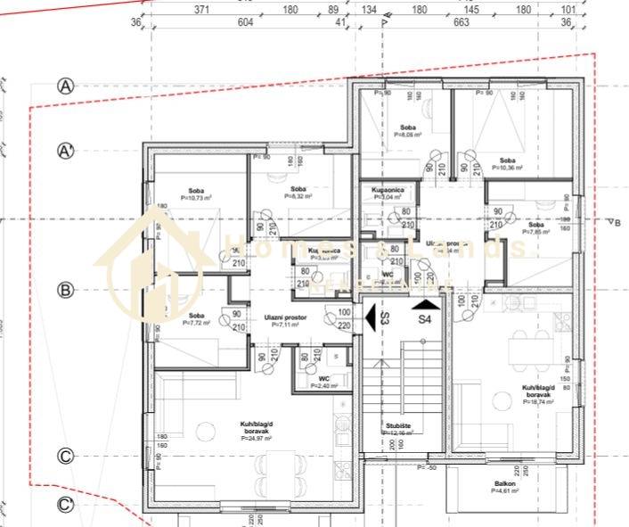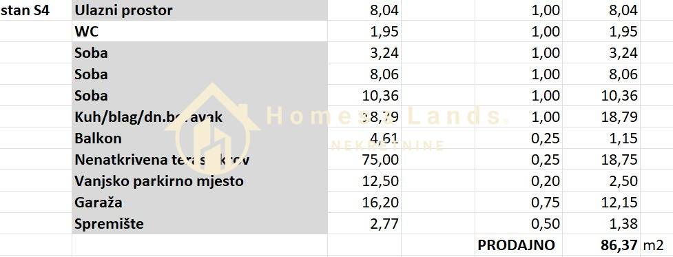Stan S4 na 1katu zgrade P4,korisne površine 161,52m2, obračunske 86,37 m2 sastoji se od ulaznog hodnika,kuhinje s blagovaonicom i dnevnog boravka,kupaonice,velike terase,tri komforne spavaće sobe, kupaonice,wc-a, garaže,na -1 etaži ,spremišta te vanjskog parkinga i nenadkrivene terase na krovu zgrade.