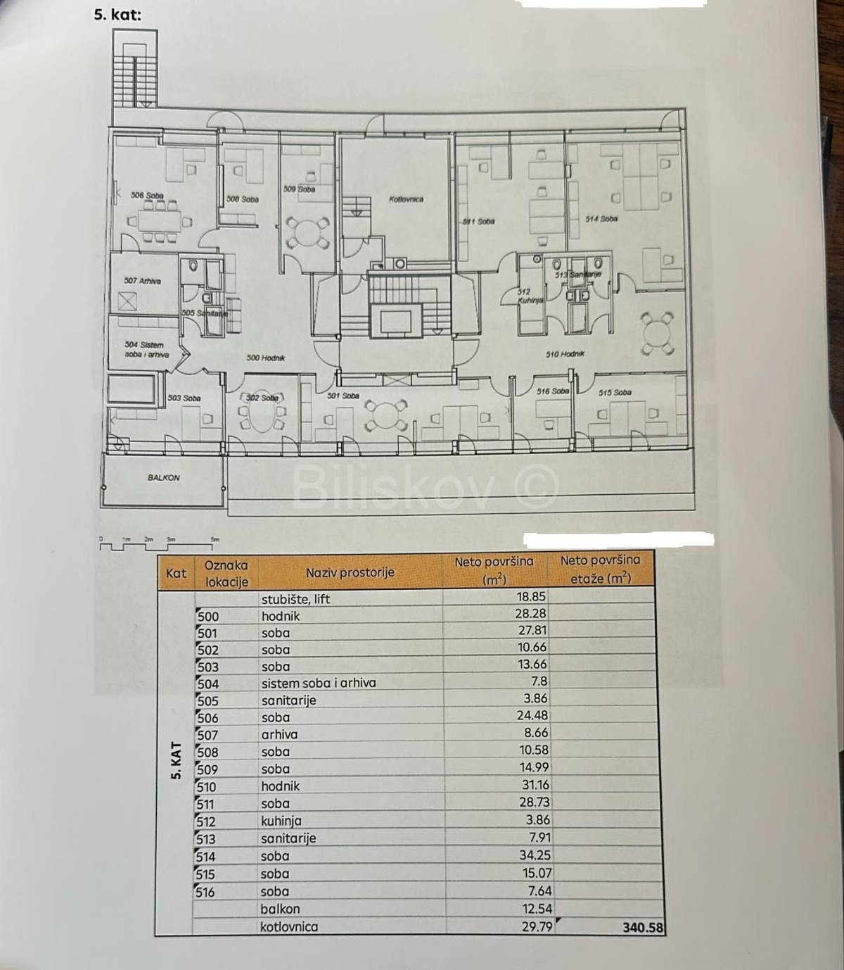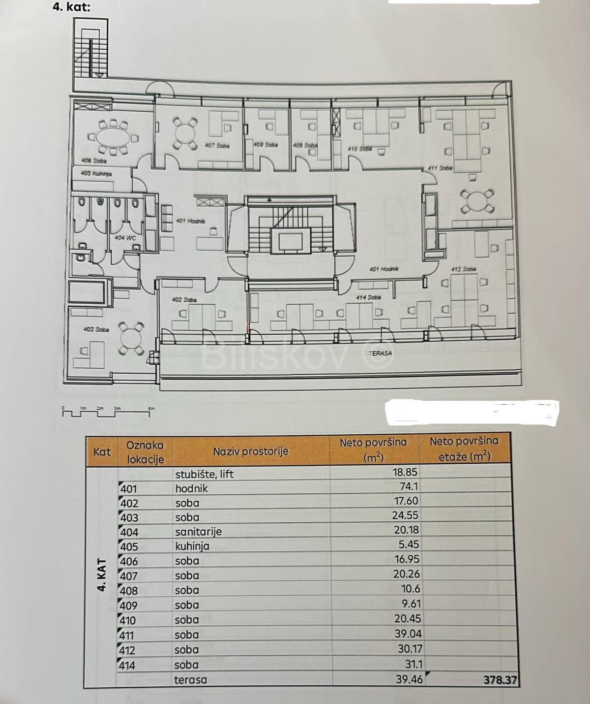 Poslovni prostor ukupne površine s terasom iznosi 718 m2, od čega se 378 m2 nalaze na 4. katu, a 340 m2 nalaze na 5. katu