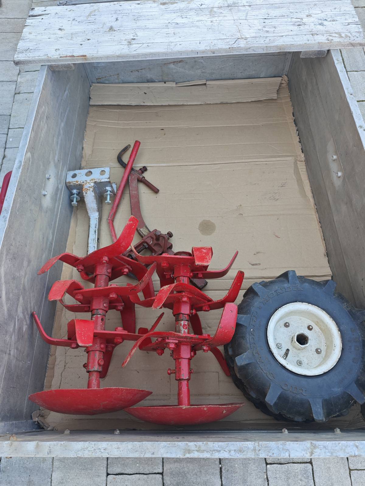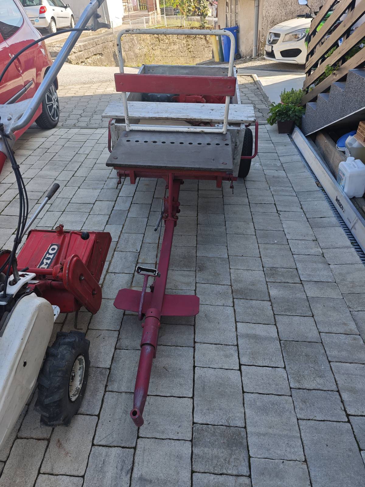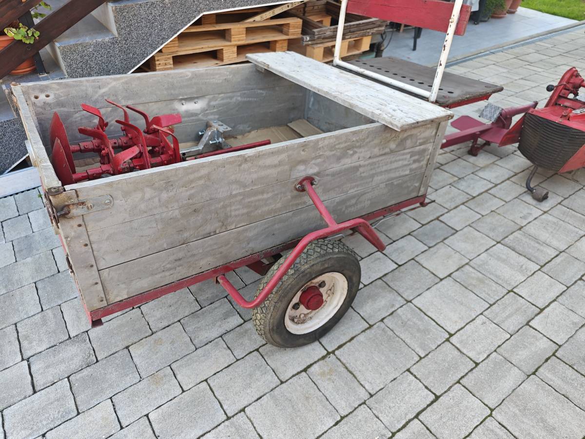 Prikolica je original MIO Standard sa nožnom i ručnom kočnicom za prijevoz povrtnih kultura i alata.