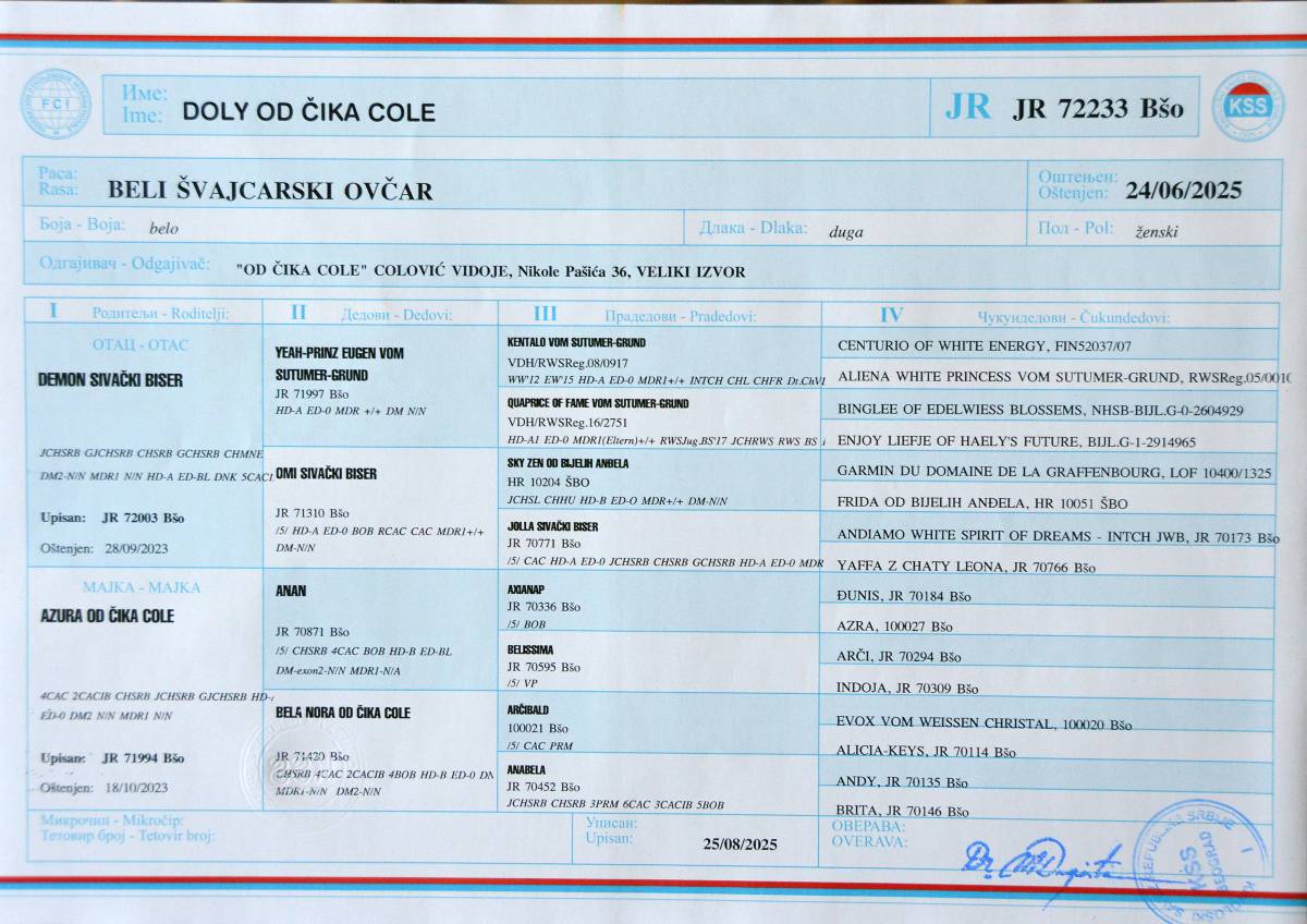 Na prodaju dugodlaka mlada ženka Belog švajcarskog ovčara, DOLY OD ČIKA COLE, okot 24.6.2025.