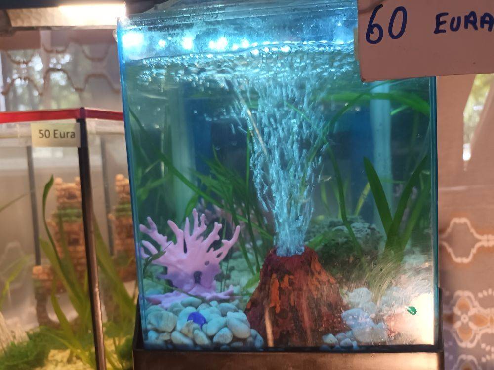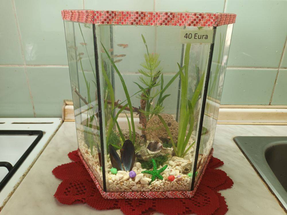 Lijepo uređen akvarij kuglu sa svime kao na slici prodajem za 30 eura. Šesterokutni za 40 i 50 eura. Ukrasni akvarij sa satom i svijetlom za 60 eura. Akvarijsko bilje 1 euro komad. Biljke šaljem brzom poštom. Šaljem slike i video. Zagreb Utrina, 091/9240-293.