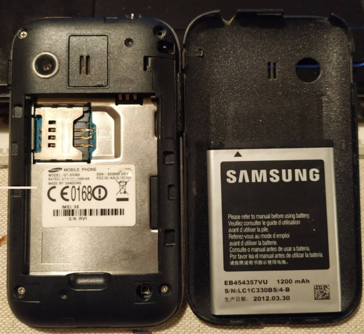 Released 2011, OctoberStatus DiscontinuedBody Dimensions 104 x 58 x 11. 5 mm (4. 09 x 2. 28 x 0. 45 in)Weight 97. 5 g (3. 42 oz)SIM Mini-SIMDisplay Type TFT, 256K colorsSize 3. 0 inches, 27. 9 cm2 (~46. 2% screen-to-body ratio)Resolution 240 x 320 pixels, 4:3 ratio (~133 ppi density)Touch sensitive controlsPlatform OS Android 2. 3. 5 (Gingerbread), TouchWiz UICPU 830 MHz ARMv6Memory Card slot microSDHC (dedicated slot)Internal 180MB 290MB RAMMain Camera Single 2 MP, f/2. 8Video 320p@15fpsSelfie camera NoSound Loudspeaker Yes3. 5mm jack YesComms WLAN Wi-Fi 802. 11 b/g/n, Hotspot functionalityBluetooth 3. 0, A2DPGPS Yes, with A-GPSRadio Stereo FM radio, RDSUSB microUSB 2. 0Features Sensors Accelerometer, proximity, compassBattery Type Removable Li-Ion 1200 mAh batteryStand-by Up to 850 h (2G) / Up to 540 h (3G)Talk time Up to 17 h (2G) / Up to 6 h 20 min (3G)Misc Colors Metallic gray, white / changeable back covers in pearly white, dark black, fruity orange, bubblegum pink and silver platterModels GT-S5360SAR 0. 57 W/kg (head) 0. 64 W/kg (body) SAR EU 0. 66 W/kg (head) Price About 70 EURTests Display Contrast ratio: 625:1 (nominal)Loudspeaker Voice 66dB / Noise 65dB / Ring 66dBAudio quality Noise -87. 0dB / Crosstalk -76. 9dB