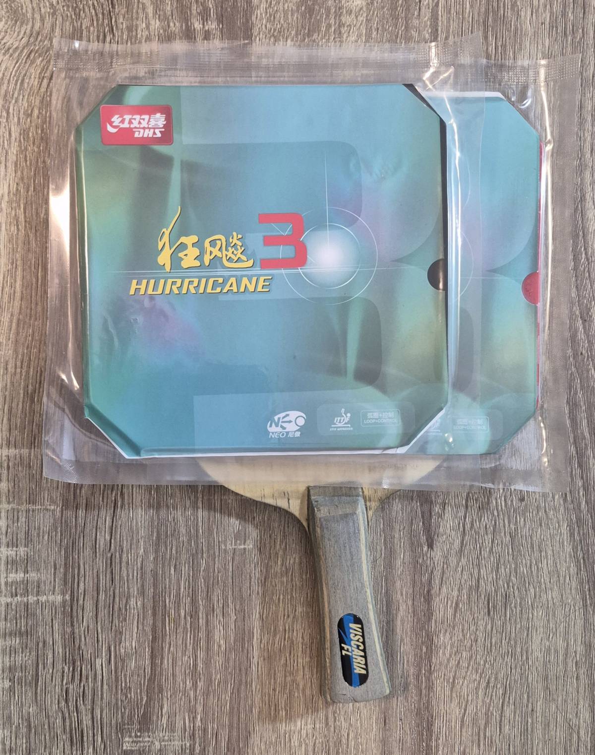 Reket je sastavljen od nježnog korištenog vrhunskog Butterfly Viscaria drveta koje teži oko 88 grama i dvije potpuno nove natjecateljske Hurricane gume.